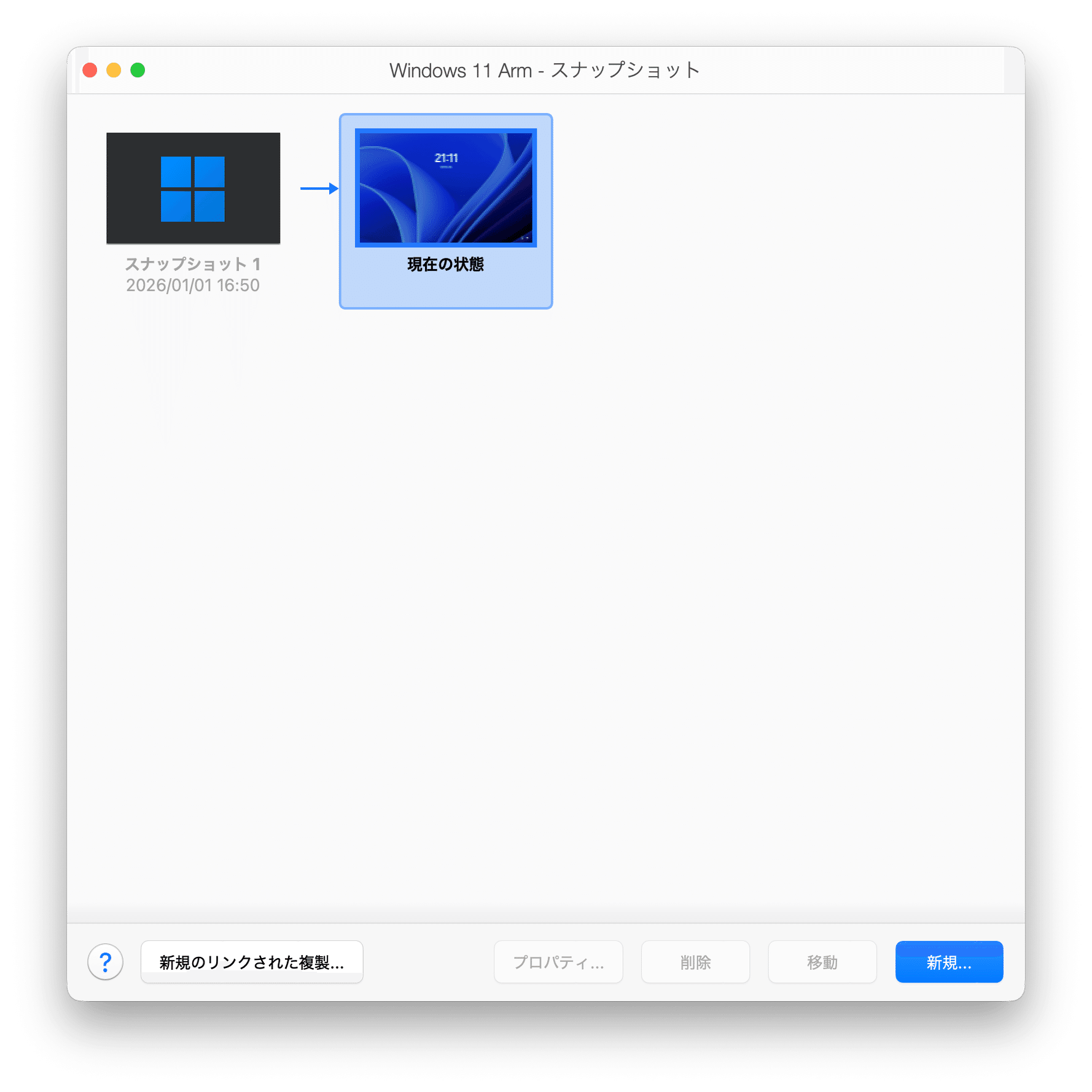 何か問題があっても元に戻せるように、Parallels のスナップショットを作ります。