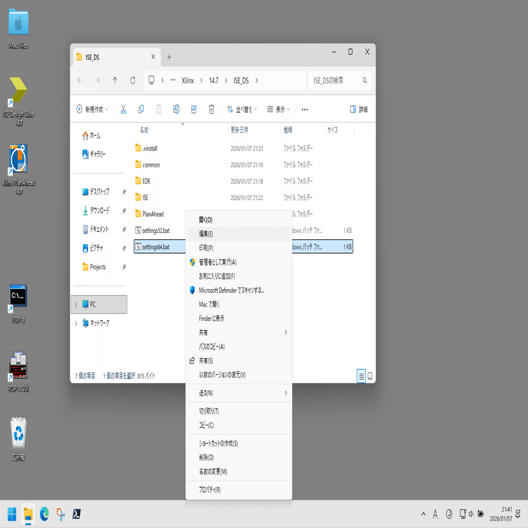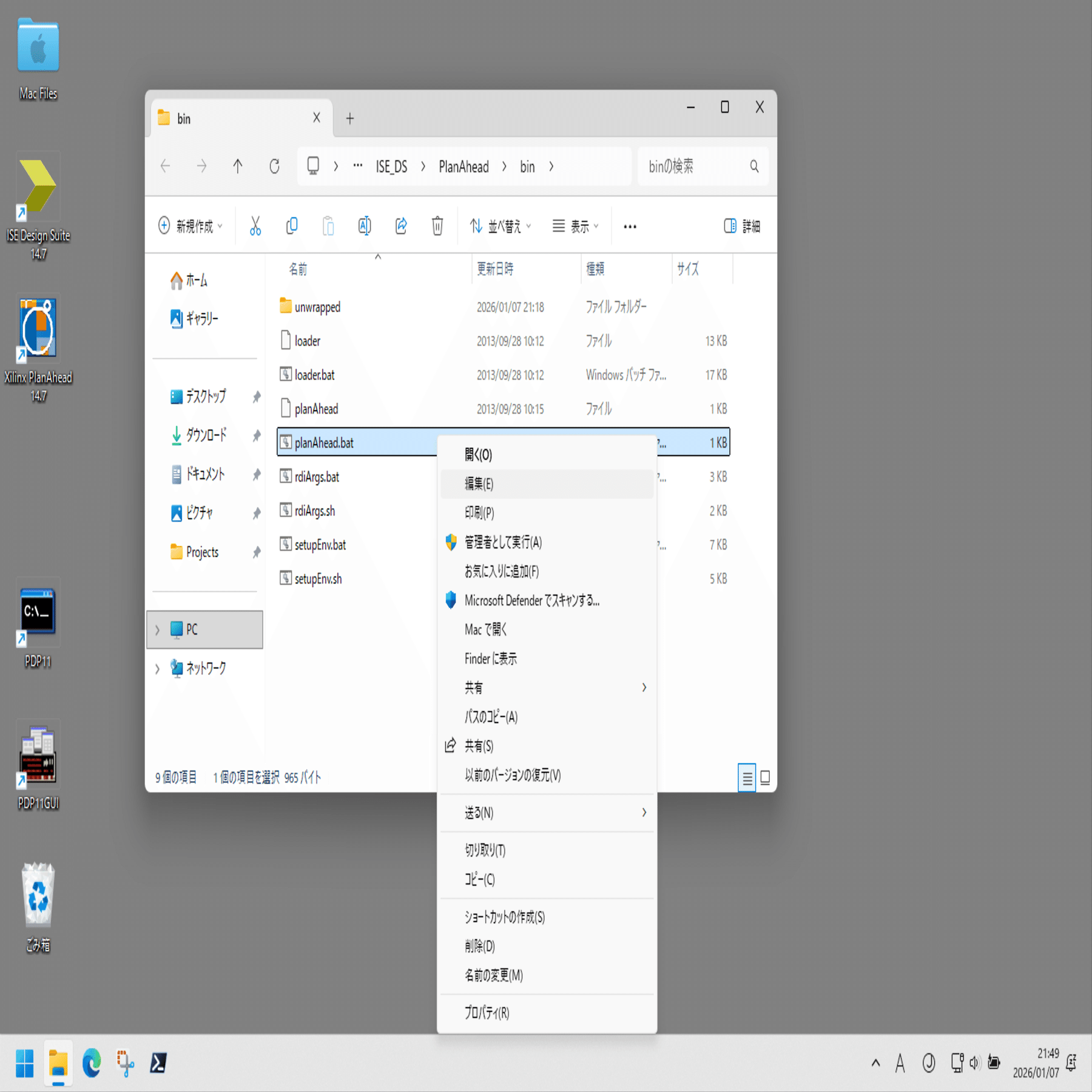 同様に、デスクトップの Xilinx PlanAhead 14.7 のリンク先の、planAhead.bat を編集。set XILINX_VC_CHECK_NOOP=FALSE を追加。