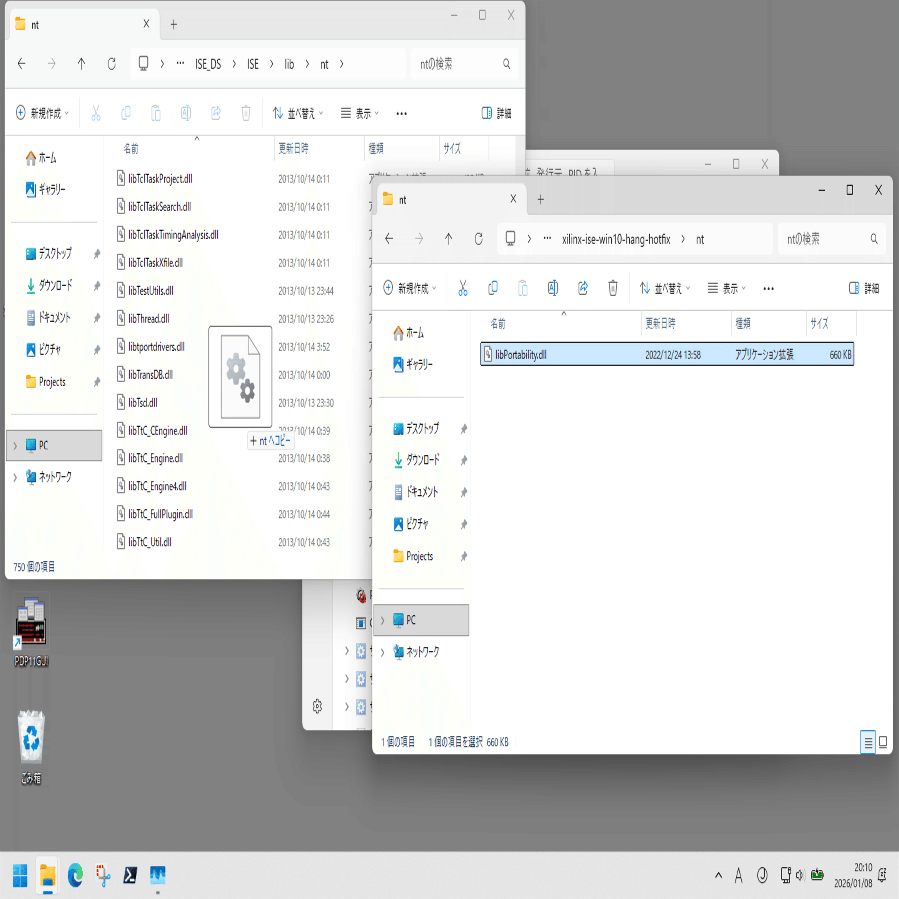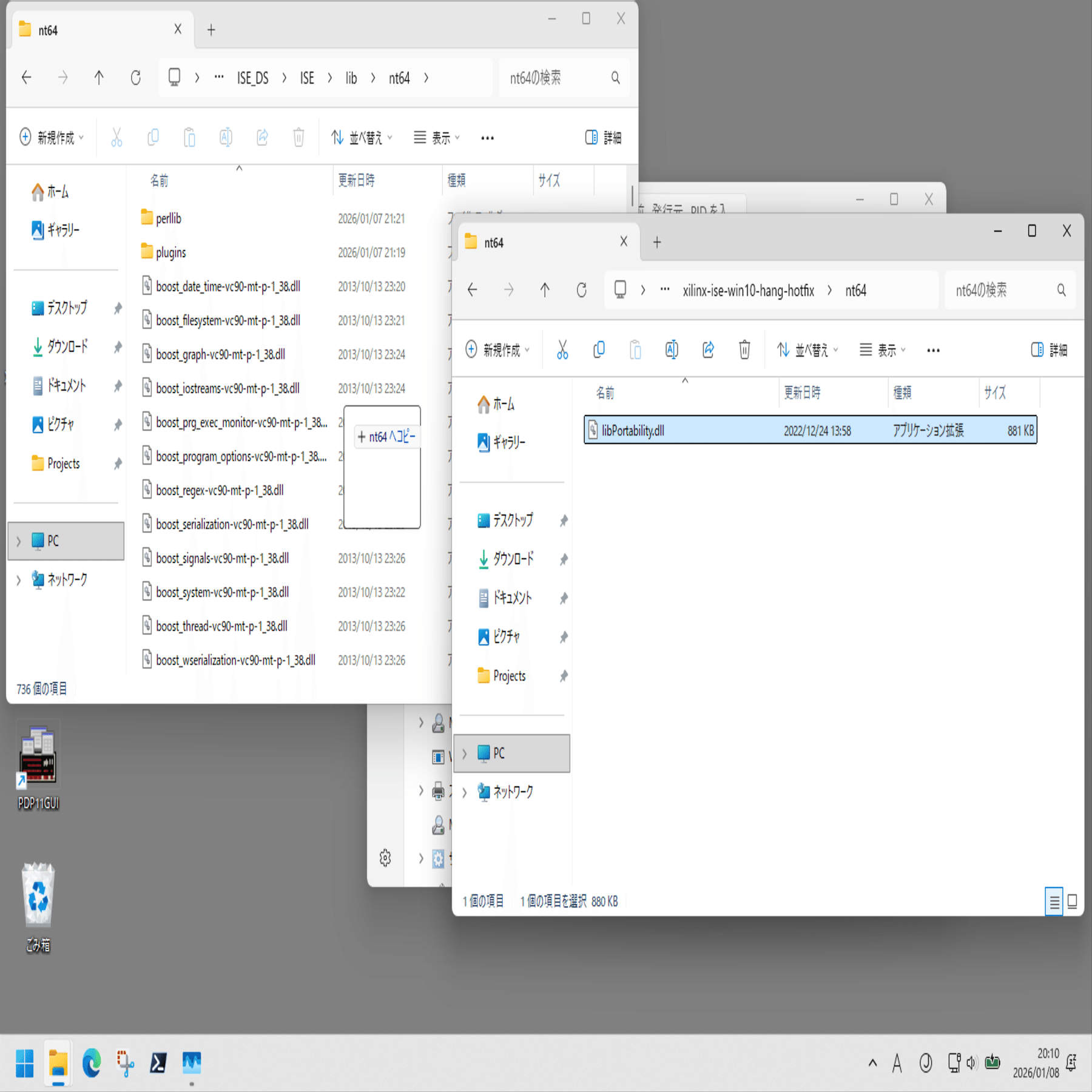 xilinx-ise-win10-hang-hotfix\nt64\libPortability.dll を下記フォルダに上書きコピー。
