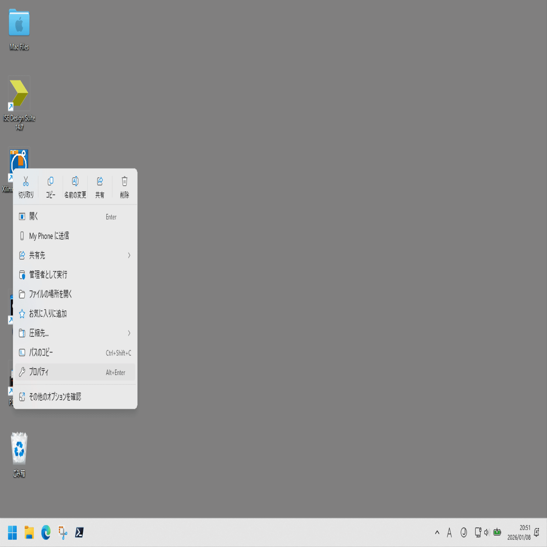 デスクトップの Xilinx PlanAhead 14.7 を右クリックし、プロパティを選択。