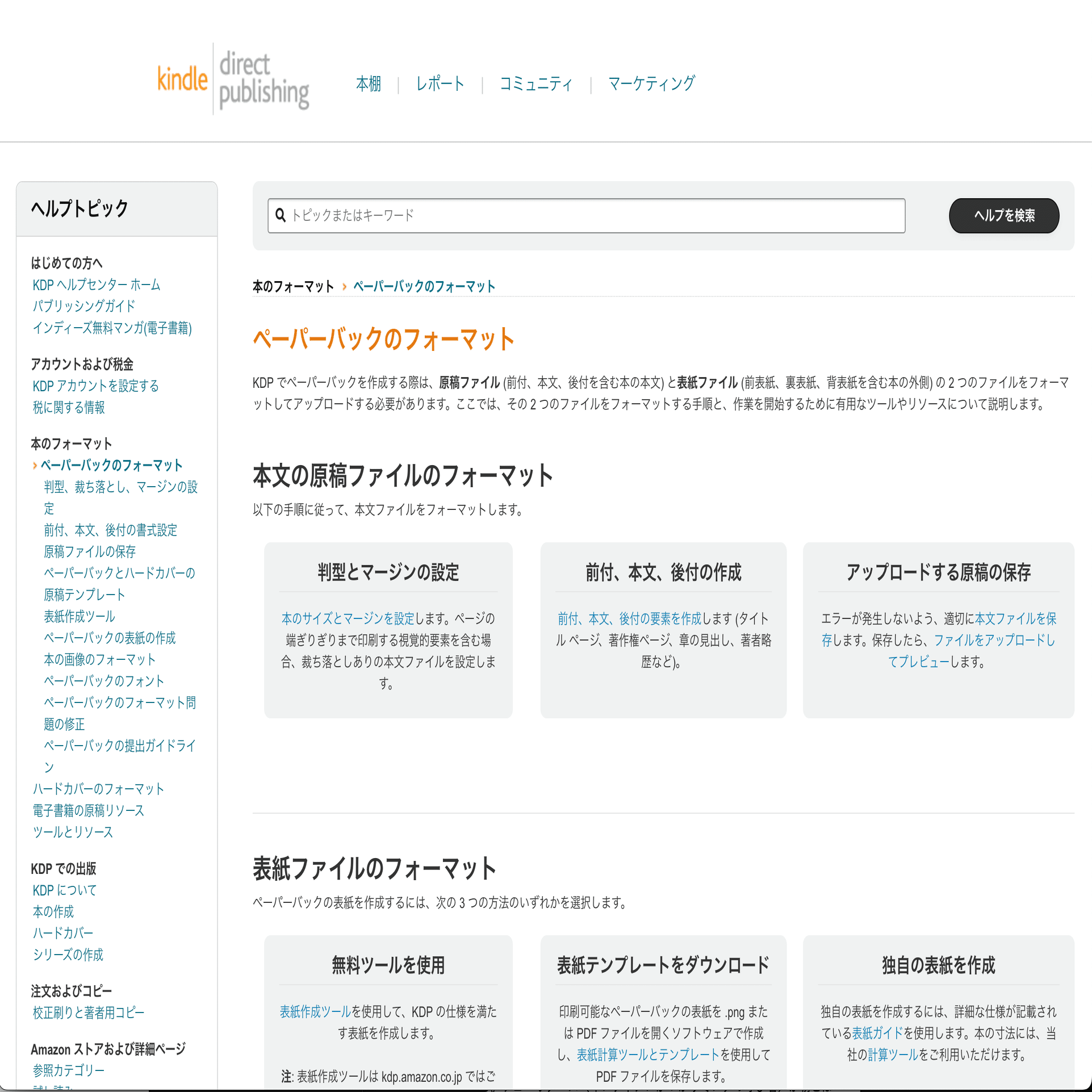 上の画像「ペーパーバックのフォーマット」のところを見てもらうとわかりますが、「本文原稿のフォーマット」「表紙ファイルのフォーマット」のところにある手順に従って、原稿の設定をしていきます。