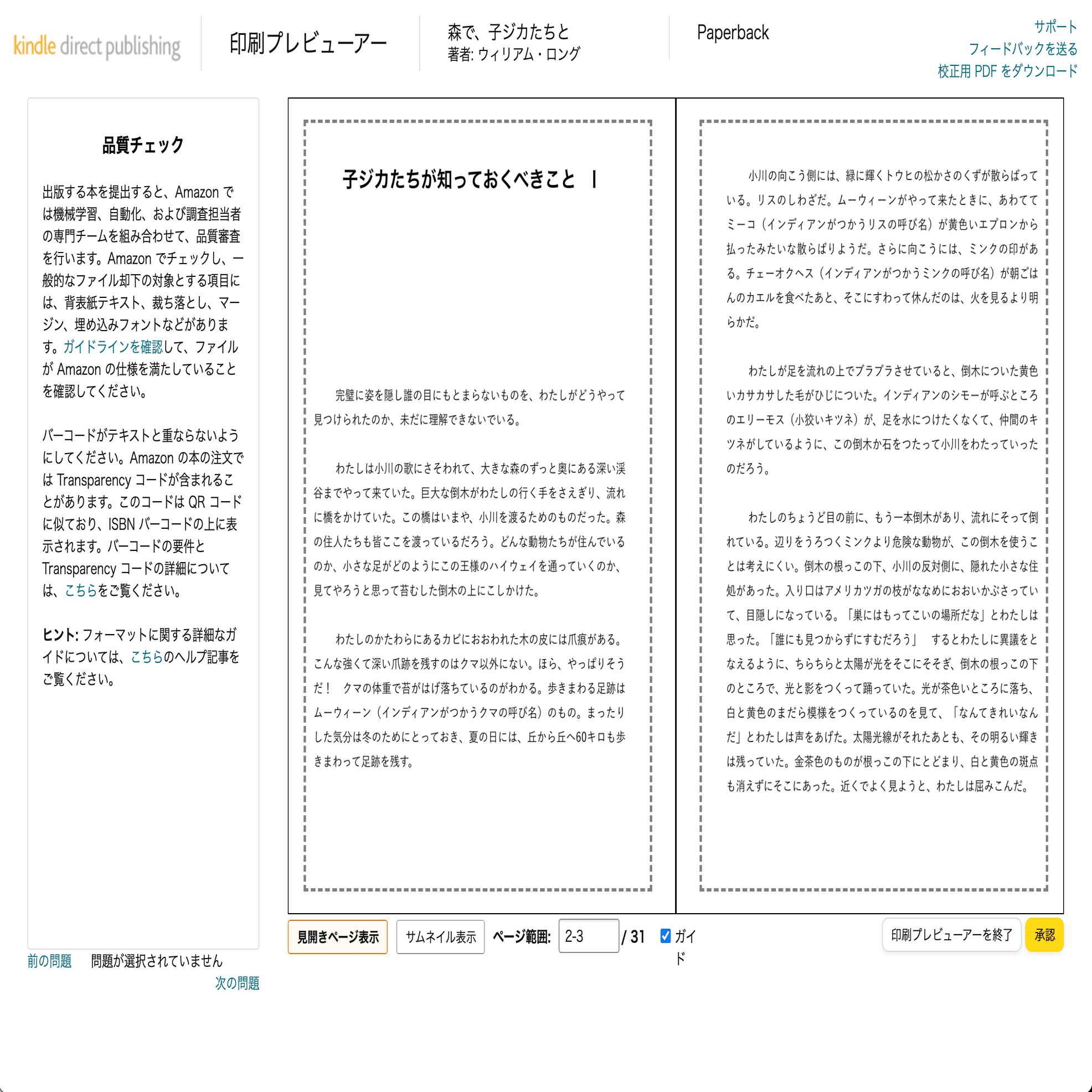 細かな指定は抜きにして、とりあえずどんな使い心地か試してみました。ノンブルや目次の指定はしていません。テストなので、フォントもとりあえずのものです。入稿データをプレビューすると、左サイドに「品質チェック」があり、印刷仕様に適さない場合は(指定に誤りがあるなど)、赤字でエラーの説明が入ります。