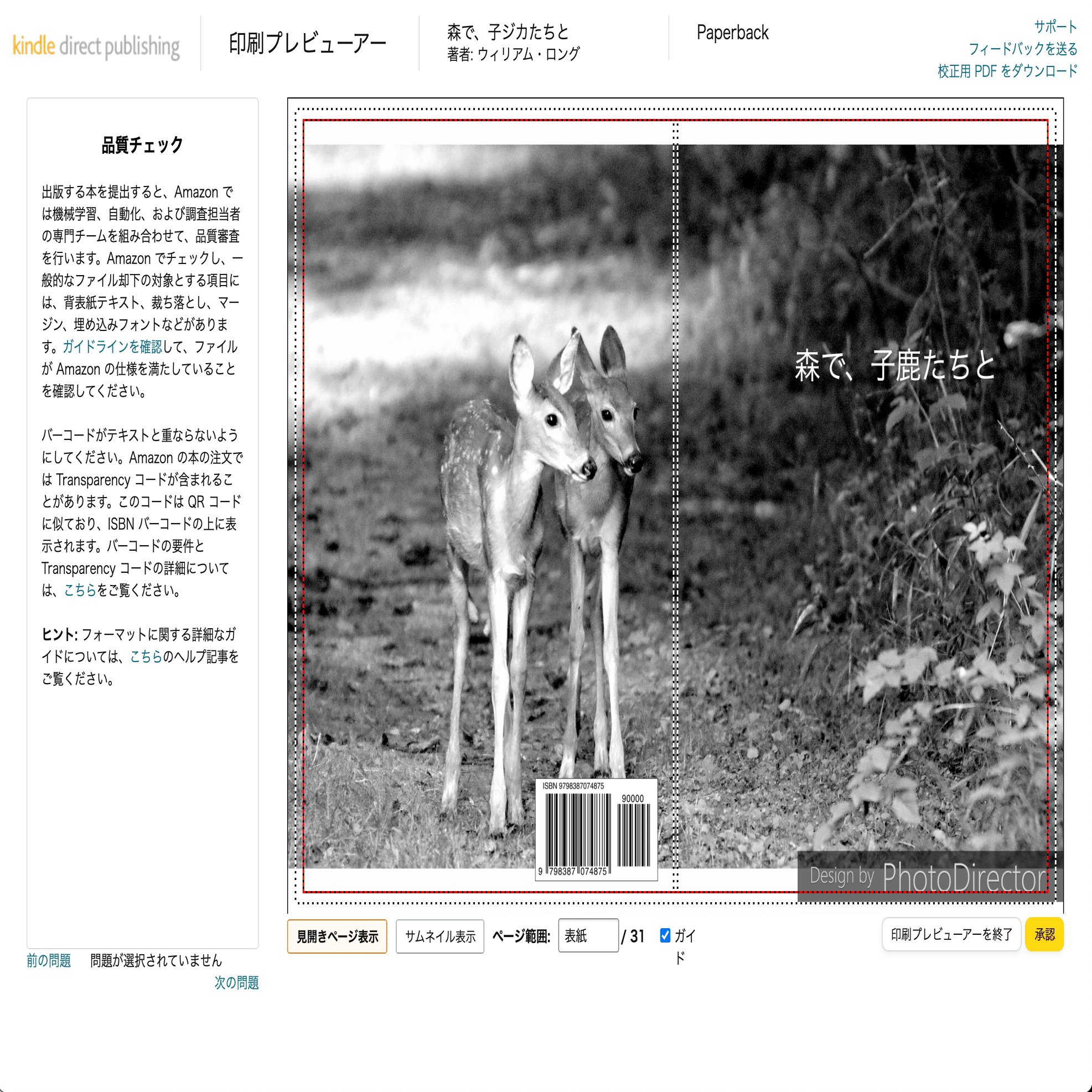 これは日本のKDPのやり方で、以前にアメリカのKDP(KEPまたはCreateSpace)で校正を取っていたときは、最終の白紙予備ページに、「Proof」の印字がしてありました。これなら本の見映えに影響しません。日本ではこの方法ではダメっていうことのようです。