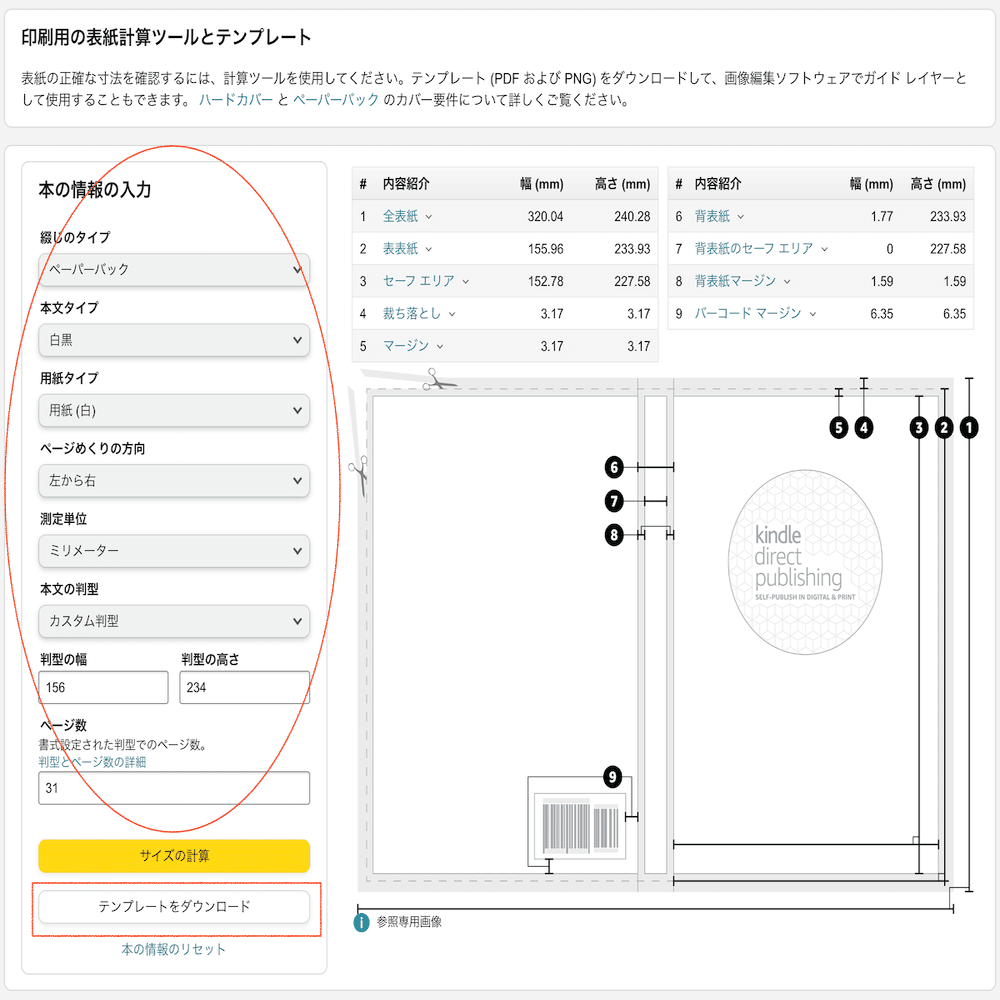 表紙を作るには、独自に制作した表紙ファイルを入稿するか、提供されているテンプレートを使います。このテンプレートがなかなか良いです。「印刷用の表紙計算ツールとテンプレート」というものがあり、順番にプルダウンメニューで自分の表紙形態に合う項目を選択します。「綴じのタイプ」からペーパーバックかハードカバーを(ただし日本ではペーパーバックのみ)、本文の印刷は白黒….という具合です。下の画像の左サイドの「本の情報の入力」というところです。この欄の一番下の「テンプレートをダウンロード」で自分の表紙のベースファイルが入手できます。