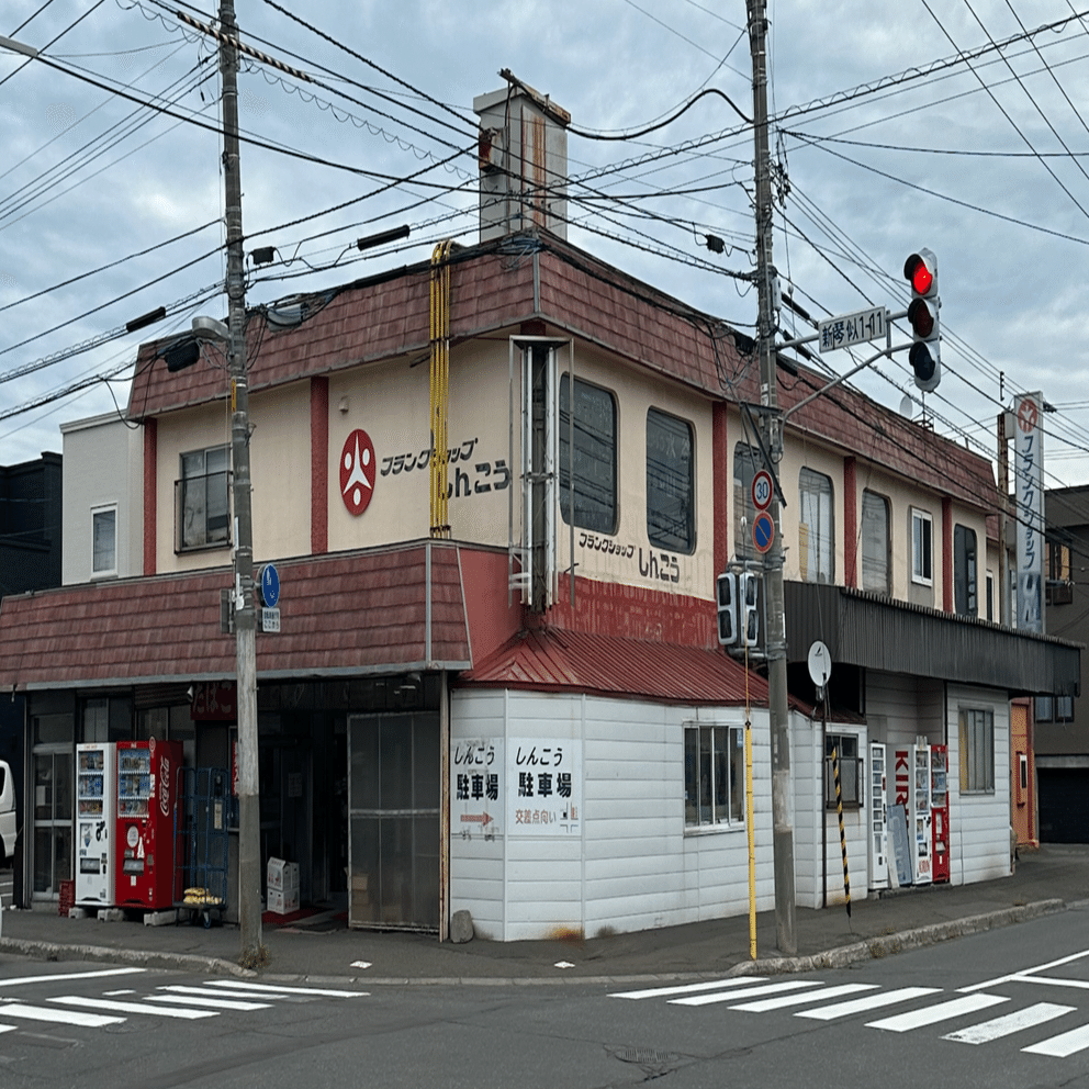 ここからまっすぐ新川通り側へ抜けようとすると新川通りの手前に、姉妹店?のフランクショップしんこうがあるが、そちらは今も営業している。昭和感溢れる建物は味があって大変良い。