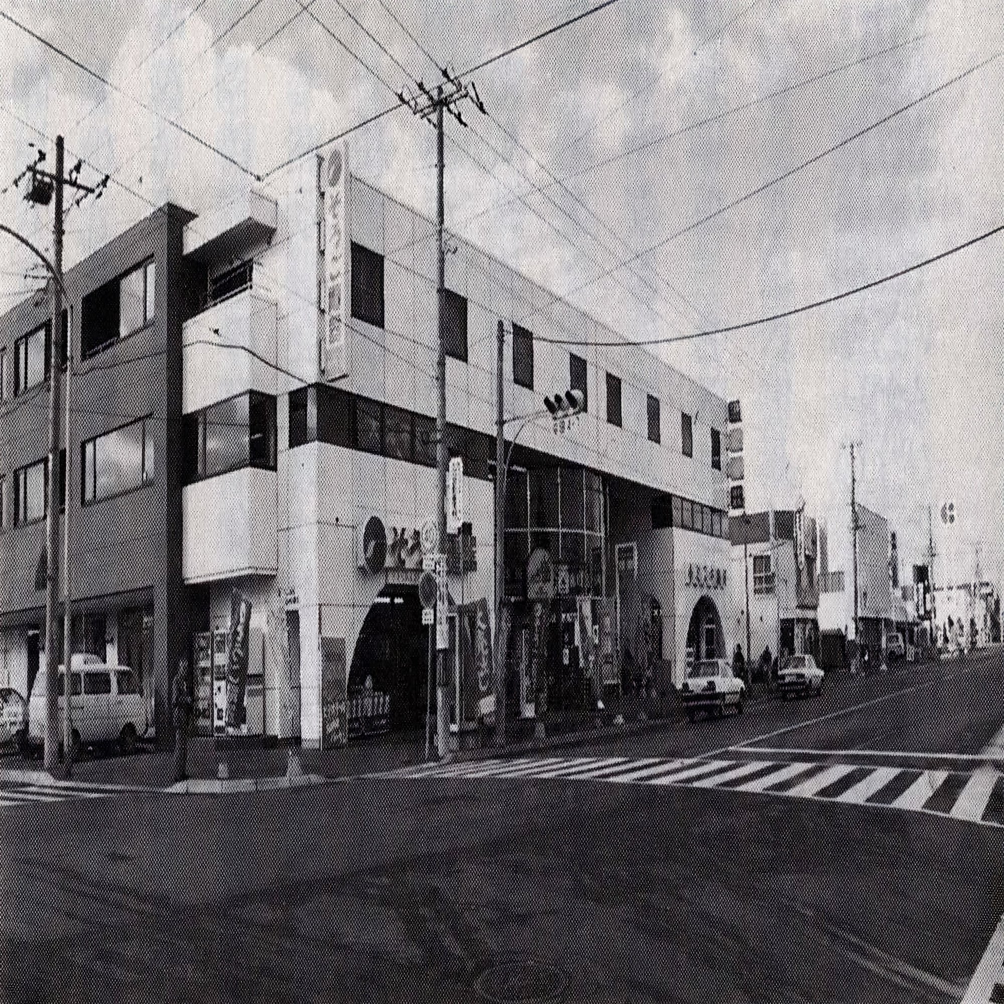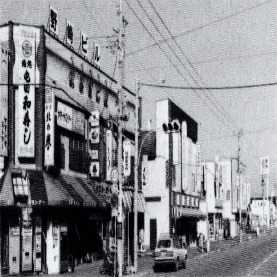 1981年に撮られたものなので生協開店から1年後。今はここに写っている全ての建物が取り壊されている。真ん中のビルはミズキ薬局だろう。野崎ビルと書いているビルとミズキ薬局は、一体化しミズキ、野崎共同ビルになった。その右横には今は美容室がある。手前の和寿司は移転し、この写真だと奥の方になる。
