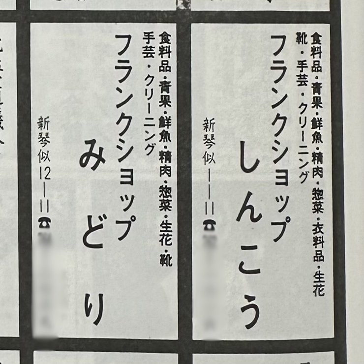 新琴似連合町内会が出している新聞「新琴似」の縮刷版を見ていたらフランクショップの名前が出てきた。「みどり」は食料品・青果・鮮魚・精肉・惣菜・生花・靴・手芸・クリーニングとある。「しんこう」の方がそれに加えて衣料品も置いている。