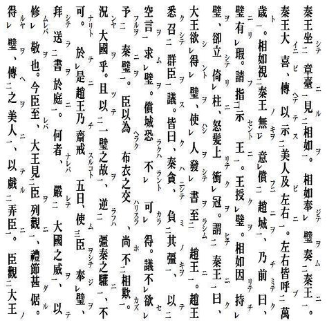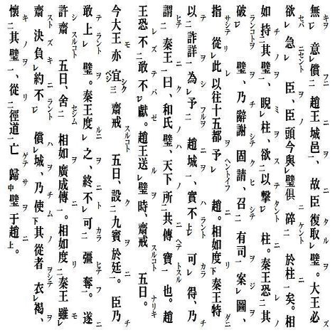 秦王、章台(しょうだい)に坐して相如を見る。相如、璧(へき)を奉じて秦王に奏(すす)む。秦王大いに喜び、伝へて以て美人及び左右(さゆう)に示す。左右、皆、万歳と呼ぶ。相如、秦王の趙に城を償(つぐな)ふに意無きを視、乃ち前(すす)みて曰く、璧に瑕(きず)有り。請ふ王に指示せん、と。王、璧を授(さづ)く。相如、因りて璧を持ち、卻立(きゃくりつ)して柱に倚(よ)り、怒髪(どはつ)上(のぼ)りて冠(かんむり)を衝(つ)く。秦王に謂ひて曰く。大王、璧を得んと欲し、人を使はし、書を発して趙王に至らしむ。趙王悉(ことごと)く群臣を召して議(ぎ)す。皆曰く「秦は貪(たん)にして、其の強(つよ)きを負(たの)み、空言(くうげん)を以て璧を求む。償城(しょうじょう)恐らくは得べからざらん、と。議、秦に璧を予(あた)ふるを欲せず。臣以為(おも)へらく、布衣(ふい)の交はりすら尚ほ相欺(あいあざむ)かず。況(いわ)んや大国をや。且つ一璧(いちへき)の故を以て、強秦(きょうしん)の驩(かん)に逆らふは、不可なり、と。是に於て趙王乃ち斎戒(さいかい)すること五日、臣をして璧を奉じ拝(はい)して書を庭(てい)に送らしむ。何となれば、大国の威を厳(おそ)れて、以て敬を修むればなり。今、臣至れば、大王、臣を列観(れっかん)に見、礼節甚だ倨(おご)る。璧を得るや、之を美人に伝へ、以て弄臣(ろうしん)に戯(たわむ)る。臣、大王の趙王に城邑(じょうゆう)を償ふに意無きを観(み)、故に臣復た璧を取る。大王必ず臣を急にせんと欲せば、臣の頭(こうべ)、今、璧と俱(とも)に柱に砕(くだ)けん、と。相如其の璧を持ち、柱を睨み以て柱に撃(う)たんと欲す。秦王、其の璧を破らんことを恐れ、乃ち辞謝(じしゃ)して固く請ひ、有司(ゆうし)を召して、図(づ)を案じ、指さして此れより以往(いおう)十五都(じゅうごと)を趙に予へんといふ。相如、秦王特(た)だに詐詳(さしょう)を以て趙に城を予ふるを為し、実は得べからざらんと度(はか)り、乃ち秦王に謂ひて曰く、和氏(かし)の璧は、天下の共に伝へて宝(たから)とする所なり。趙王恐れ、敢て献(けん)ぜずばあらず。趙王、璧を送る時、斎戒すること五日なりき。今、大王も亦宜しく斎戒すること五日、九賓(きゅうひん)を廷に設くべし。臣乃ち敢て璧を上(たてまつ)らん、と。秦王之を度るに、終に強(し)ひて奪ふべからずと。遂に許し齋(さい)すること五日、相如を広成伝(こうせいでん)に舍(しゃ)せしむ。相如、秦王斎すと雖も決(かなら)ず約(やく)に負(そむ)き、城を償はざらんと度り、乃ち其の従者をして褐(かつ)を衣(き)、其の璧を懷(いだ)き、径道(けいどう)より亡(に)げて、璧を趙に帰さしむ。