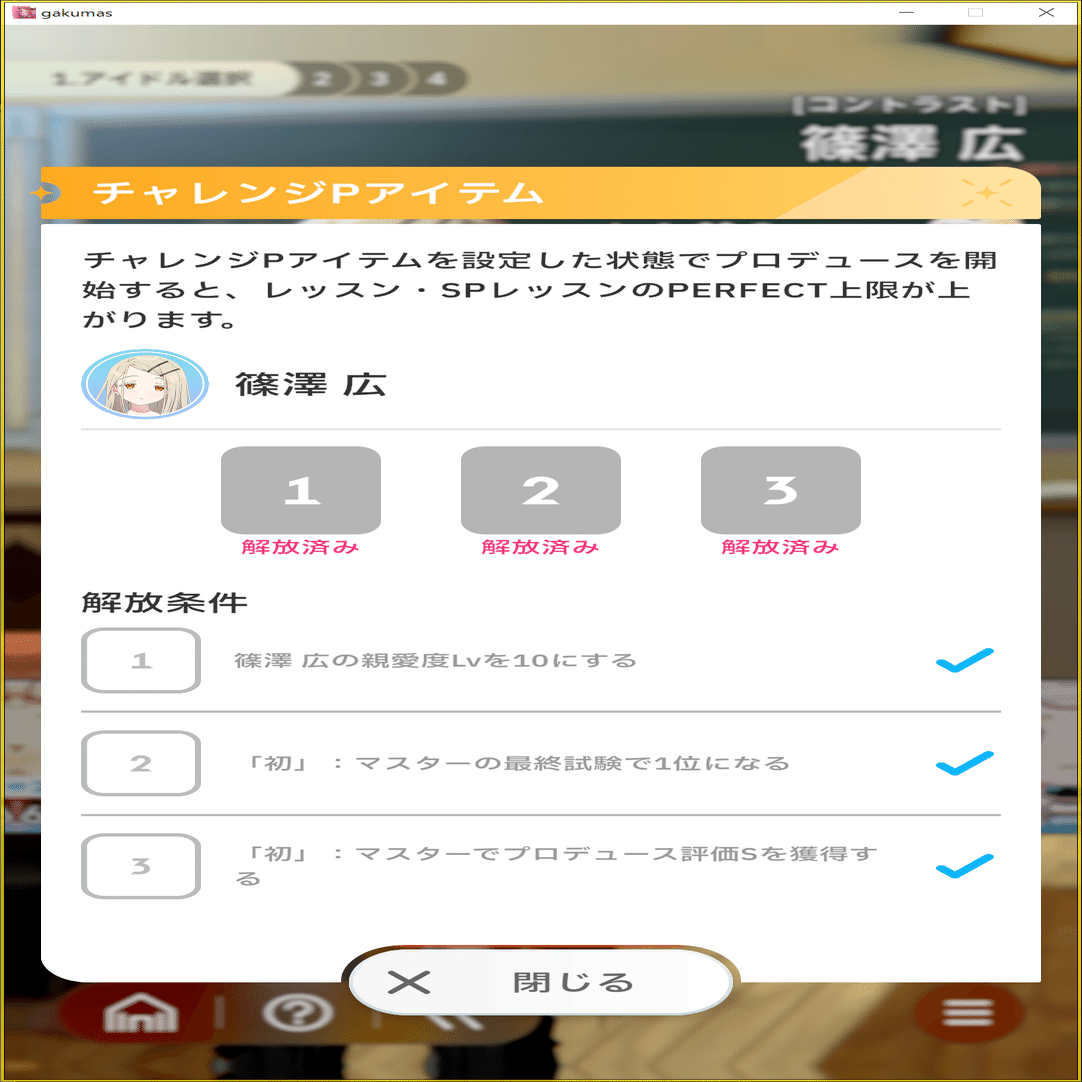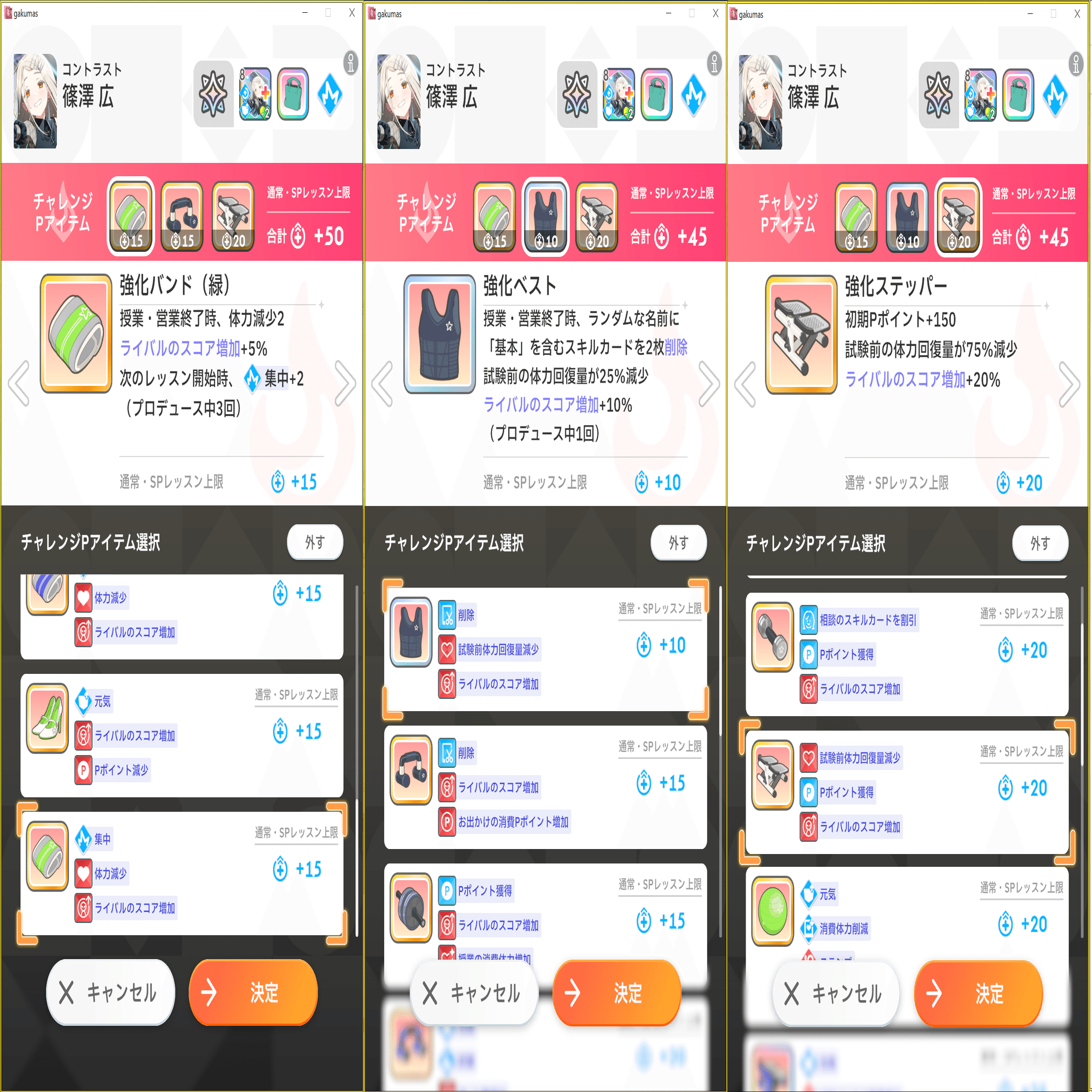各キャラ最大3種類まで設定出来て、アイテム毎に異なった効果をもたらしつつレッスンのクリア上限があがります。(=ステータスを今までよりも更に伸ばせるようになります。)