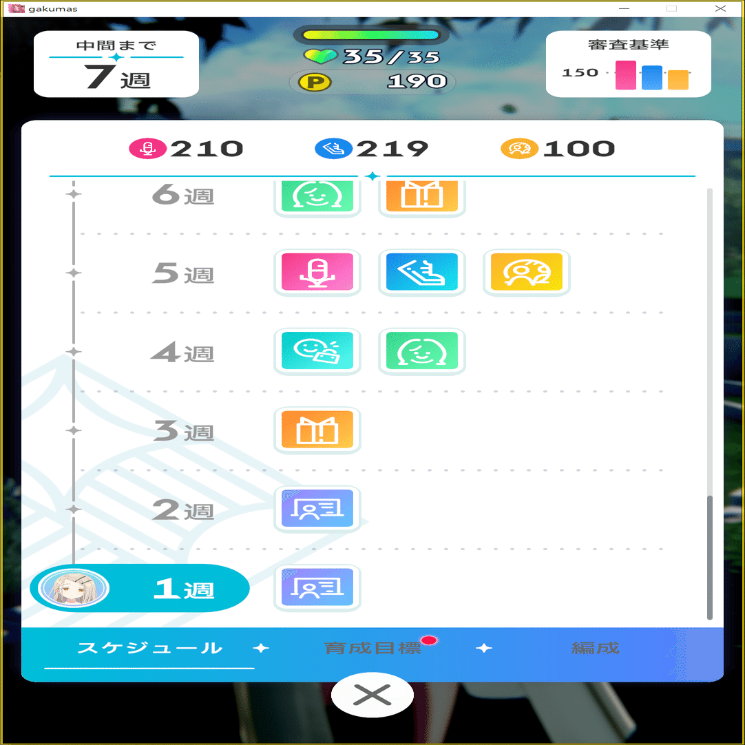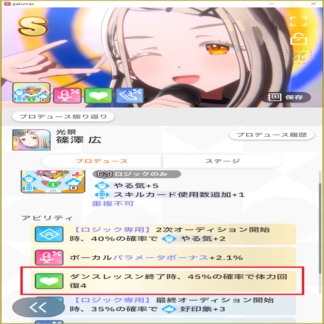HP管理もかなりシビアになるため、メモリーのアビリティに「〇〇レッスン終了時、体力回復〇」系のアビリティがあると安定します。