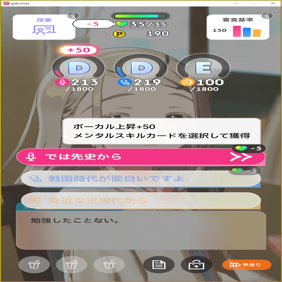 デッキ圧縮が最重要なのでトラブルカード取得の選択肢は絶対に選ばず、HP消費系の選択肢のうち、得意種目かつ上昇量の高い選択肢を選んでいきます。