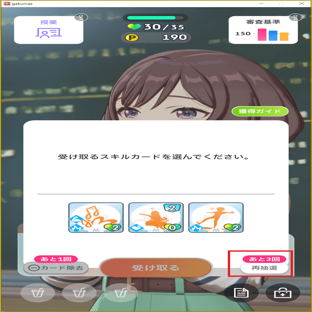 親愛度10まで達成したことで、「再抽選」が使用できるようになっていると思います。提示された選択肢が悪い場合は再抽選を使用していきます。