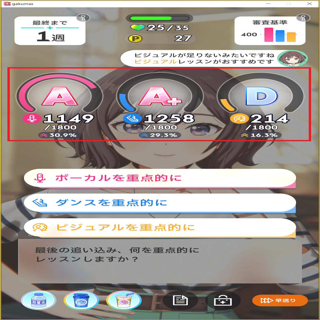 また、レッスン回数そのものが大幅に少なくなるため、SPレッスンの確率を上げることが非常に重要になって来ます。
