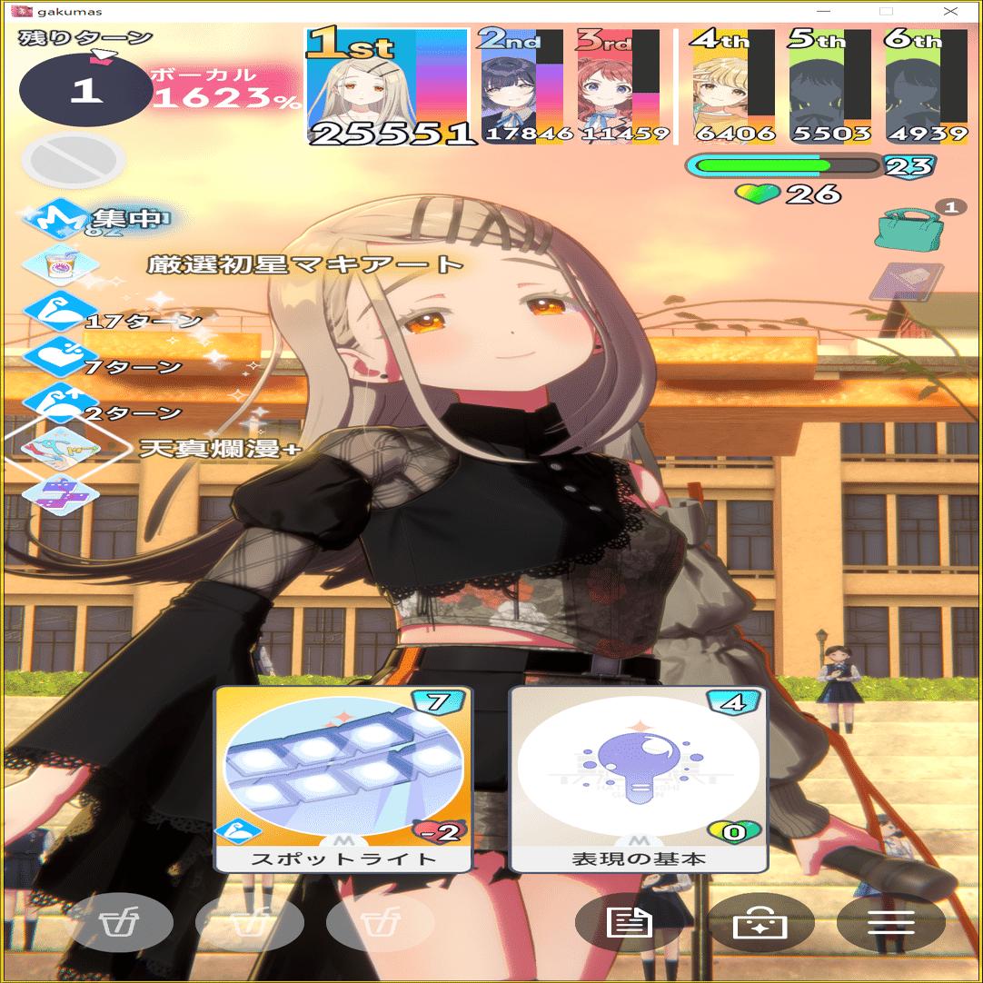 序~中盤までやる気・元気を稼ぎ、最終ターンに火力。