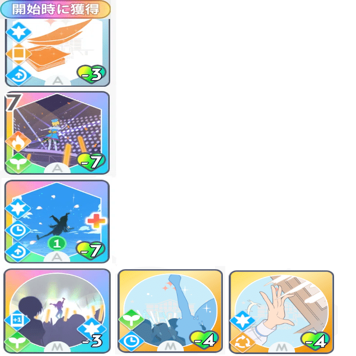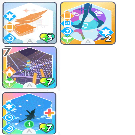 手札を保留に回すカードやドリンクで「アイドルになります」を保留に回して、全力ターンに積み重ねや総合芸術に効果を発揮できるようにするとより強力です。