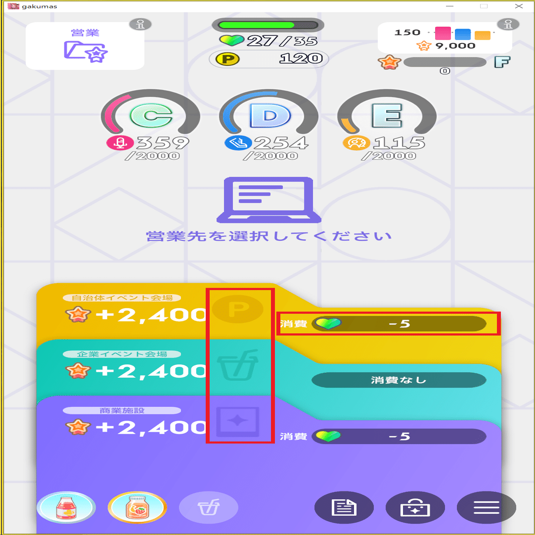 HP状況によっては、営業でHP回復を選択する必要があります。(営業でHPが回復するPアイテムもあるのでそういったものを活用するのも有りです。)