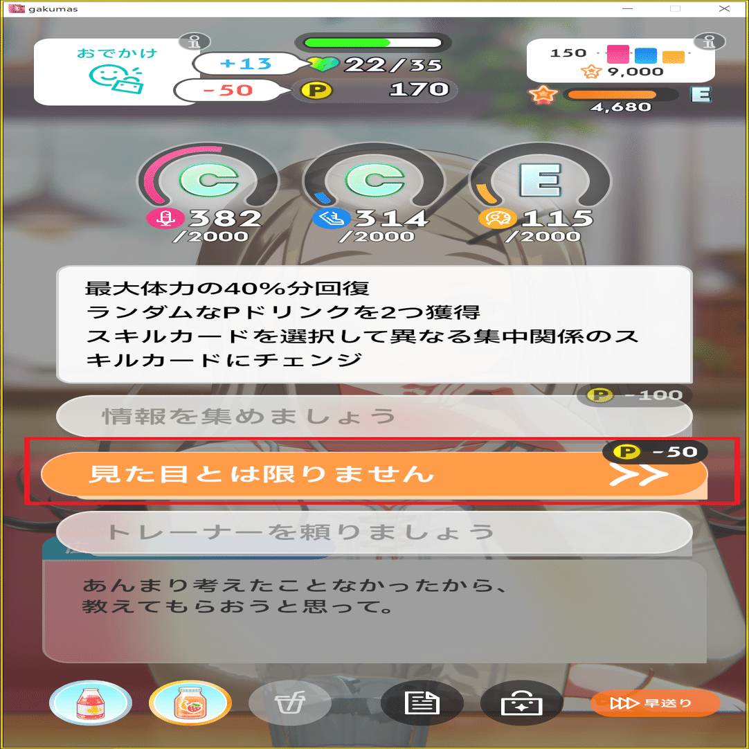 上述した「おでかけ」でドリンクが補充されるため、スコアを伸ばすためにもガンガン使用してきましょう。(「初」編の中間追込みと同じ考え方です。)
