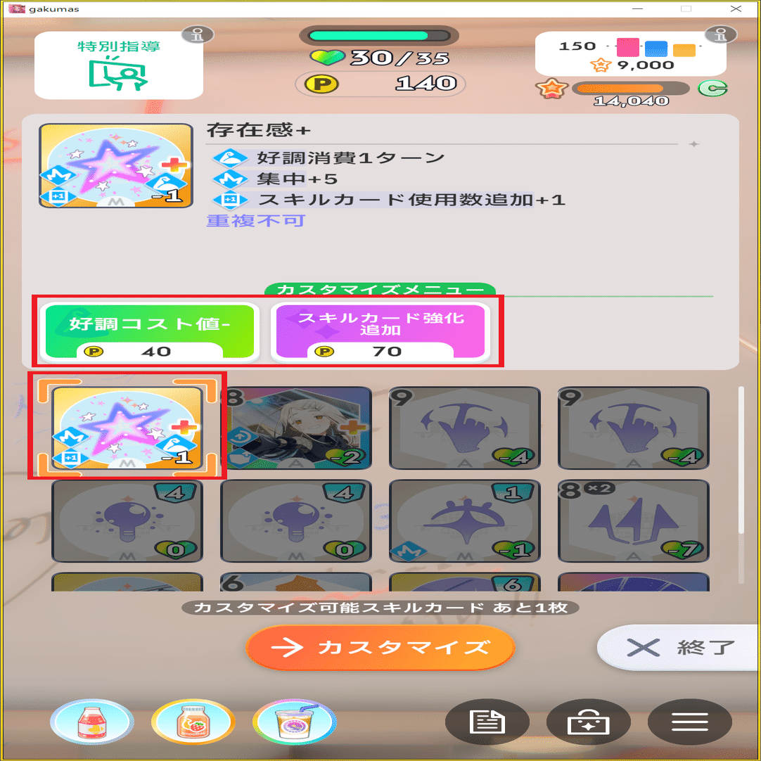 強化済みのカードを選択し、Pポイントを消費してカードに追加効果を与えることができます。(各特別指導毎に1枚まで)