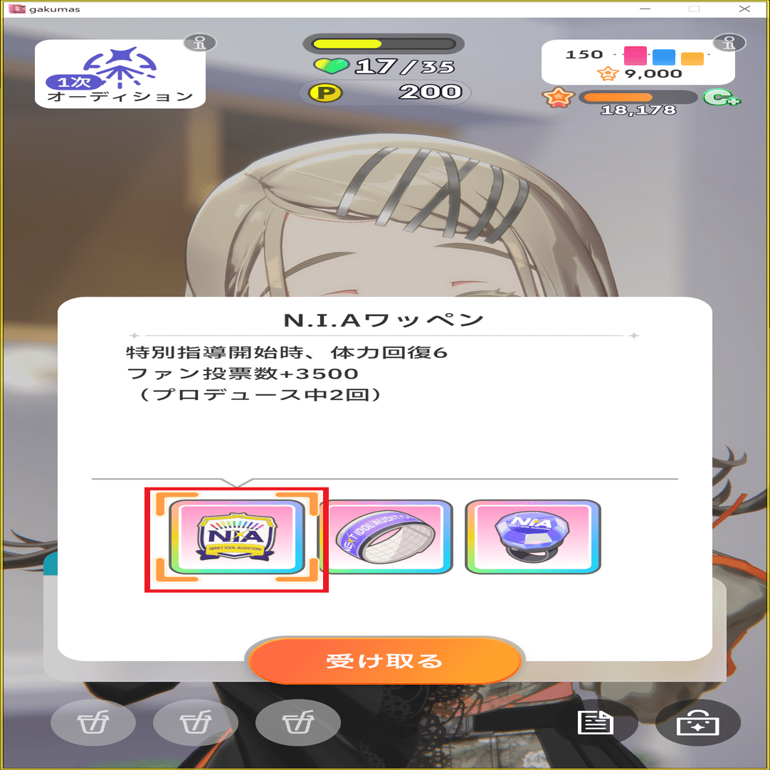 1次オーディション終了後に選択できるプロデュースアイテム(以下Pアイテム)で、ファン数の増加を狙うことができます。