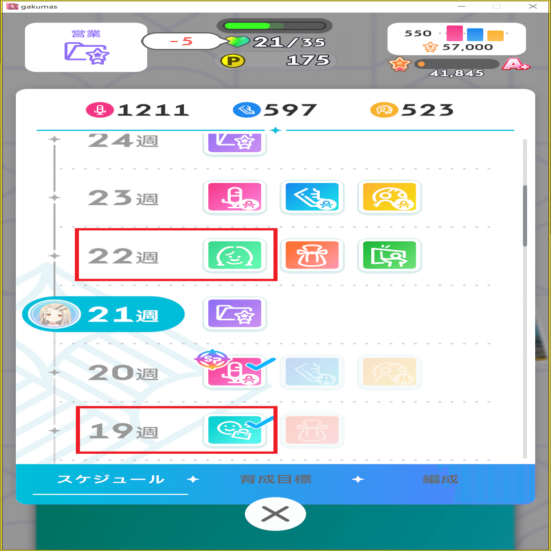 22週目に相談があり、ここが最後の強化・削除を行えるポイントなのでPポイント200以上の状態でこの週に到達するようにしましょう。