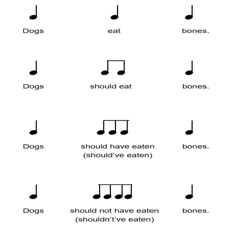 DogsとBonesのあいだに一音節(eat)しか入らないときには「タン、タンタ、ン」という単調なリズムでよいのですが、たとえばshould eatのように2つの音節が入るときには、「タン、タタ、タン」と真ん中の2つの音を短く発音しなければなりません。さらに、should have eatenように3つの音節が入ると「タン、タタタ、タン」と真ん中に3つの音を入れなくてはなりません。