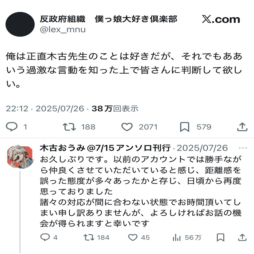 その四日後、木古氏のアカウントから次の声明文が投稿されました。