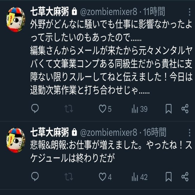 仕事上の迷惑さえなかったら全然ネタにしまくりたいのに……暇なニートの捨て垢と違って文で金を稼げてしまう私が憎い……(ドブカス)