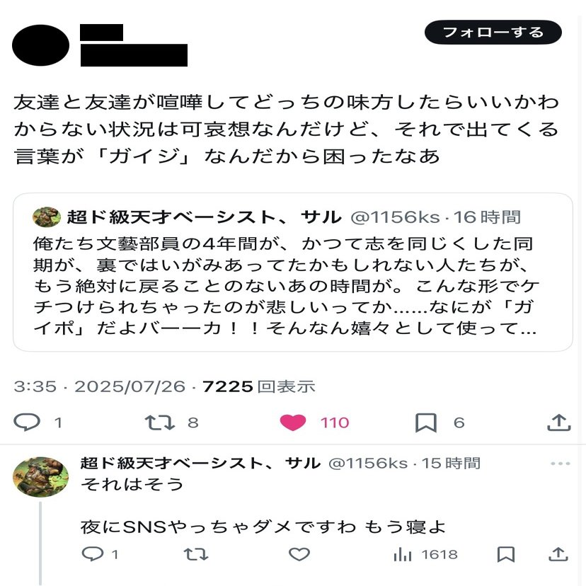 て露悪的な表出の仕方になっちゃってたけど、「ガイポ」とかいう言葉面白がって流行らせてた自分らのこと何も反省せずにそれを非難する私のこと「臭い善人」呼ばわりするのは、創作者のクセに想像力無さすぎてドン引きするわ。