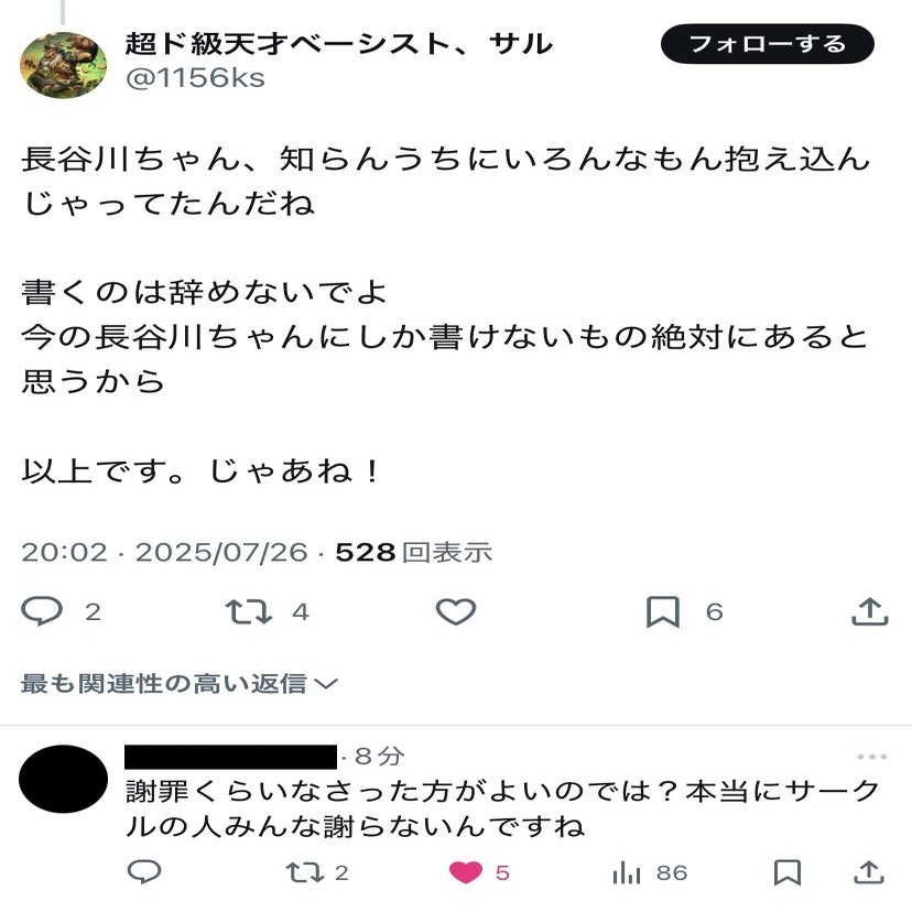 2025 年7月 25 日の X での今回の事態発生の初期段階から、当事者である長谷川氏にはメッセージアプリを通じて謝罪と釈明を行い、弁護士確認の下、私自身の X アカウント上でも声明文の掲出を行うとお伝えし、個人間での和解の道を模索しておりました。