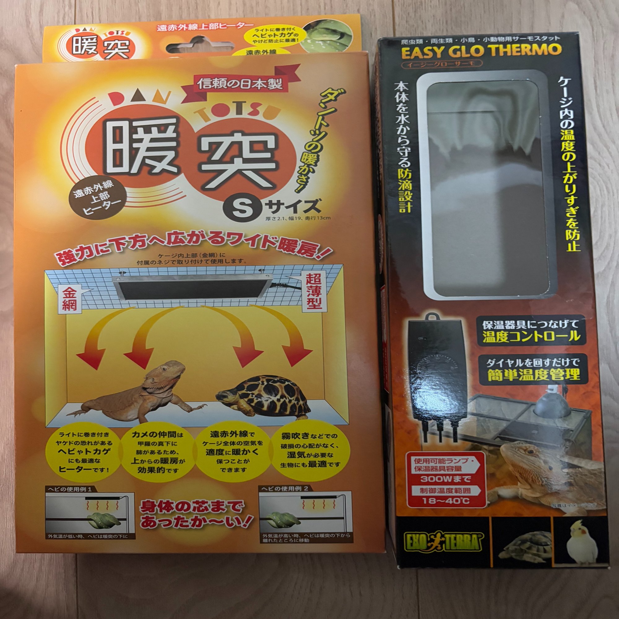 ヒーターとして「暖突」を使用してケージ内の温度を上げ、温度が上がりすぎないよう「イージーグローサーモ」を併用しています。