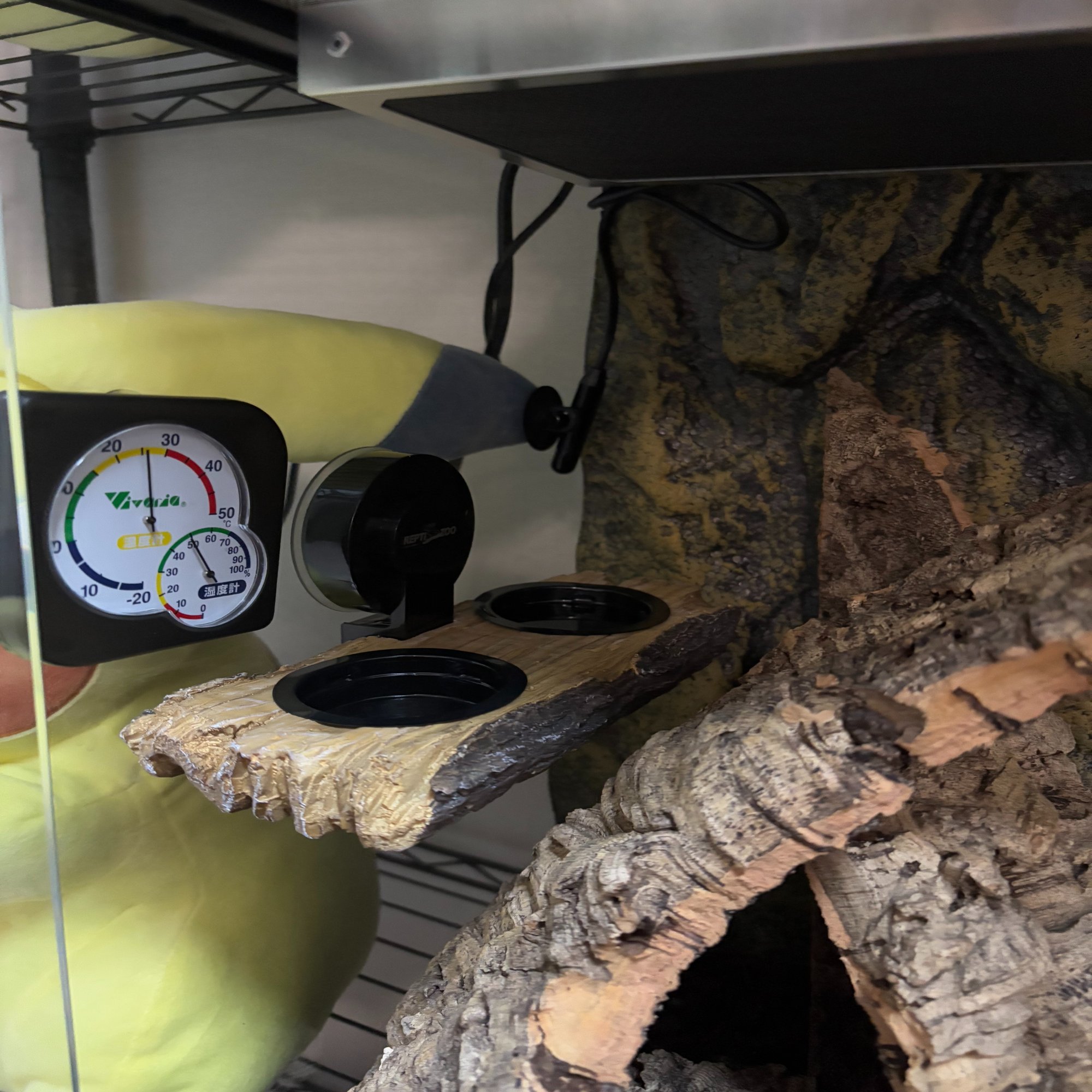 爬虫類の飼育においては温度と湿度の管理が重要です。種によりますが、寒いと活動できず、上がりすぎても良くありません。ショップでは部屋全体を空調で温度管理しており、その中で飼育していました。我が家の飼育環境ではそれを再現できないため、ケージに温度管理用の器具をつけています。