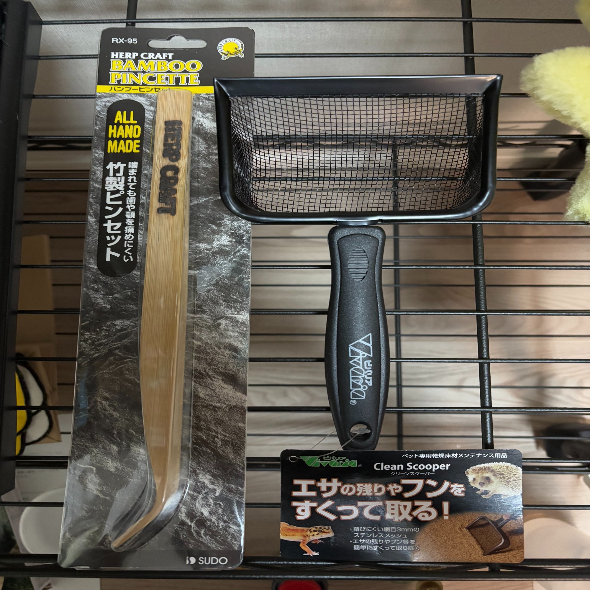 排泄物を床材ごとすくい取って廃棄、新たな床材を補充するときに使用するスコップ、給餌用のピンセットです。給餌は現状前述のレパシーしか与えていないのでピンセットは使用していませんが、バナナなどの果物をピンセットで与えるとよく食いつくという情報があったため念のため用意しました。