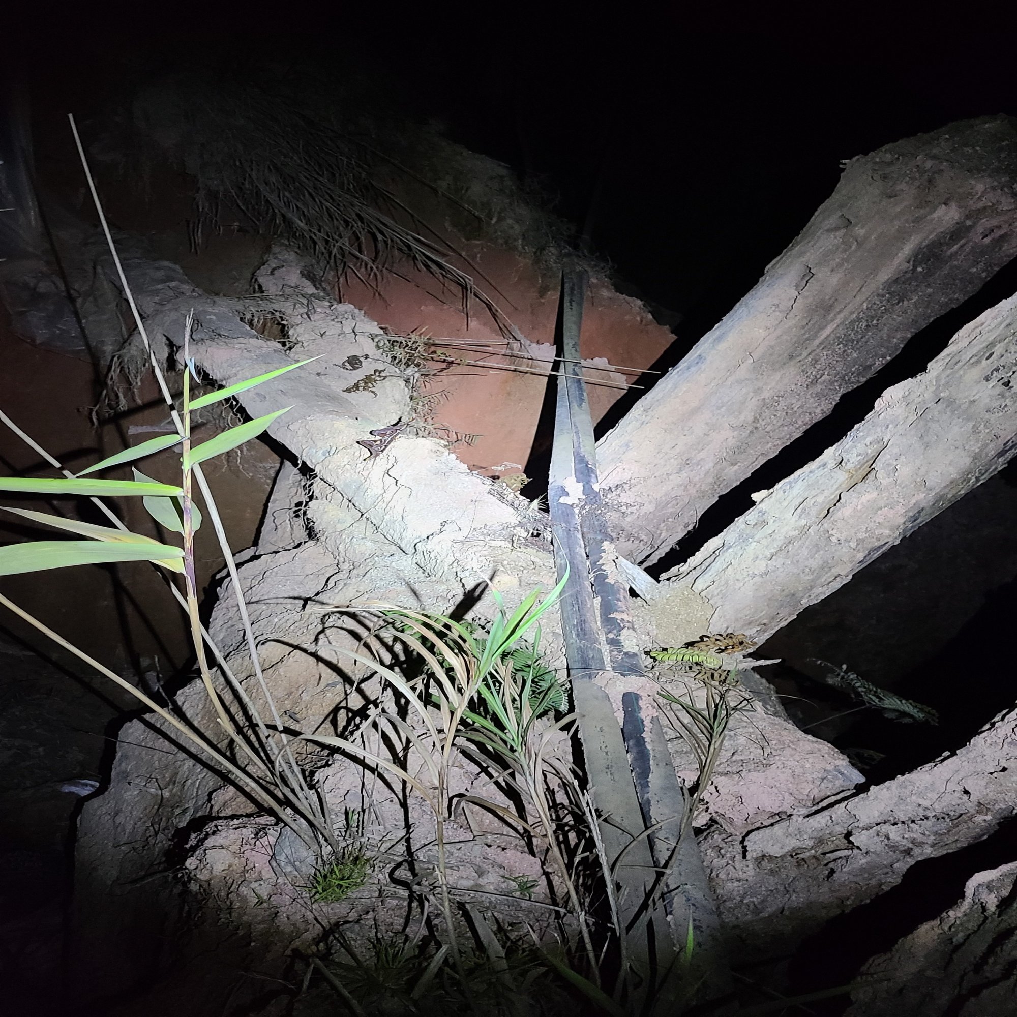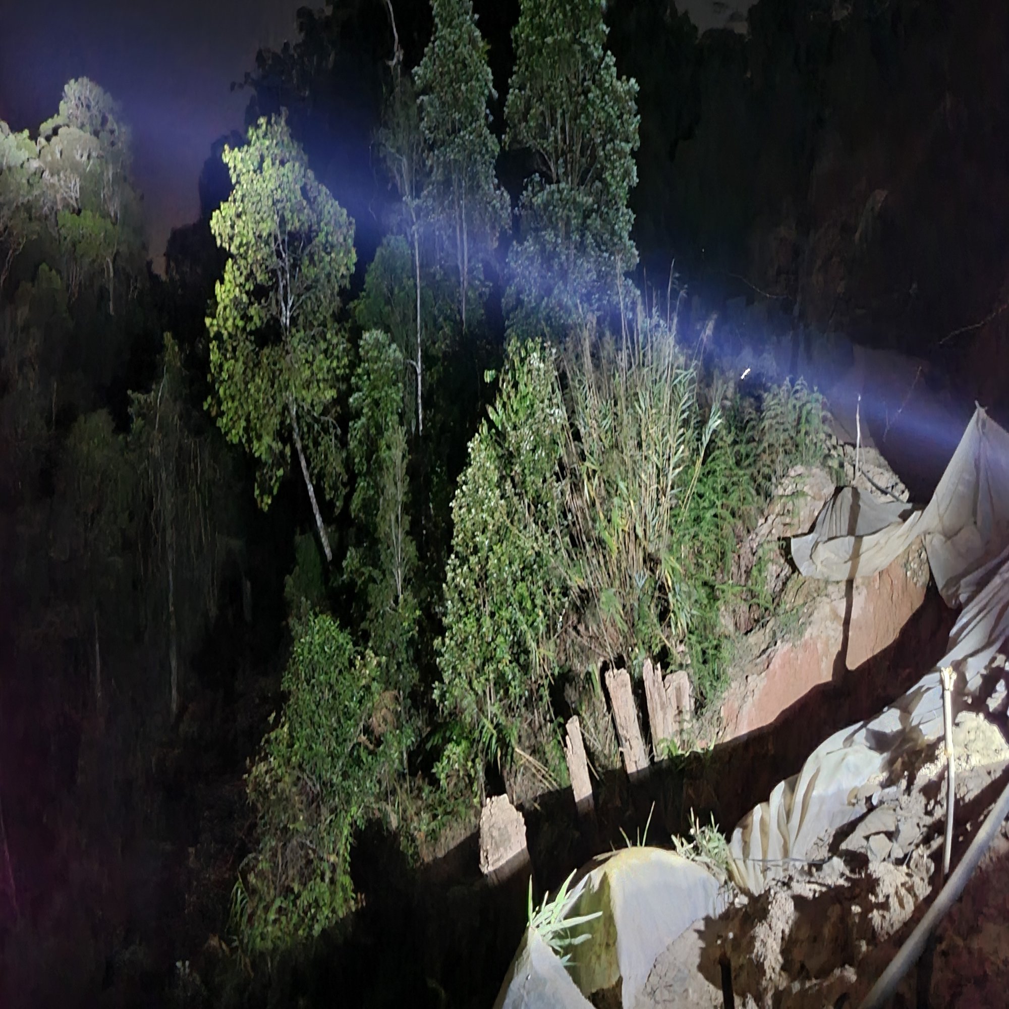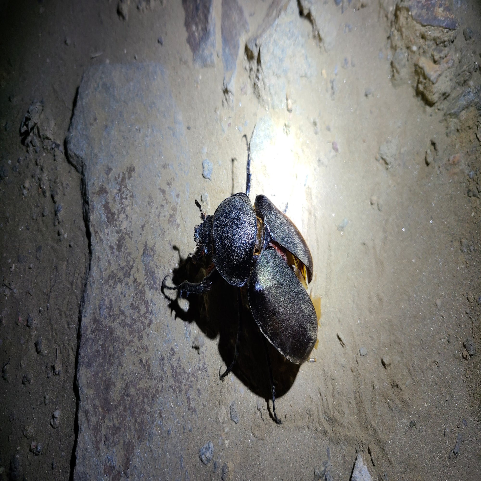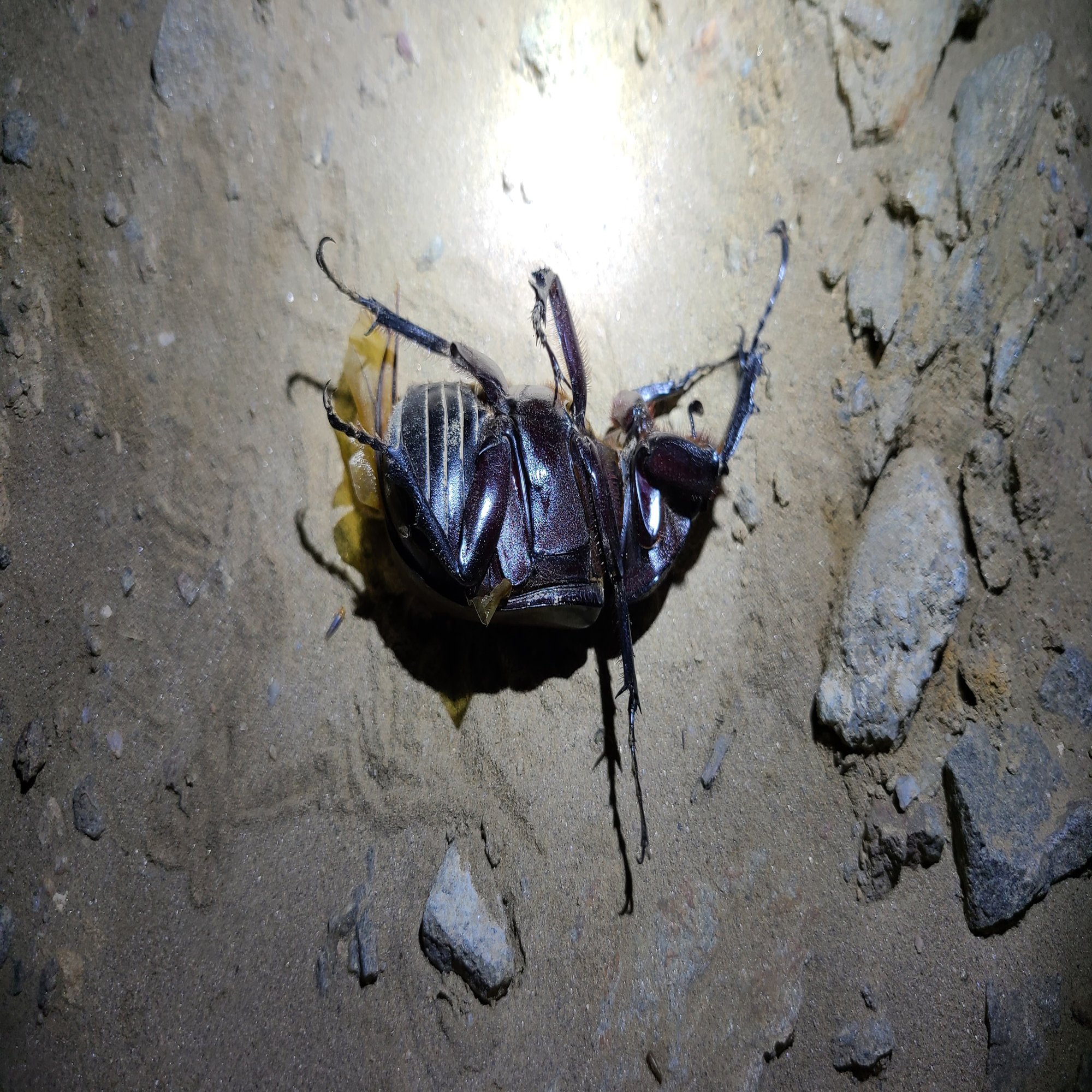いきなり崖の下の方からバカでかい音の羽音が聞こえてきました。さらに崖の方をハンディライトで照らすと2匹の虫がなにやらライトへ向かって暴れながら飛来中…