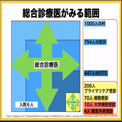 1000人の村で、症状がある人は794人。その中でどこかを受診するのが206人。そして大学病院を受信するのは10人です。「受信したのを誰でも診る」、つまり206人を診るのが「総合診療医」と思われがちですが、総合診療医は1000人の村全体を診る仕事だ、といいます。