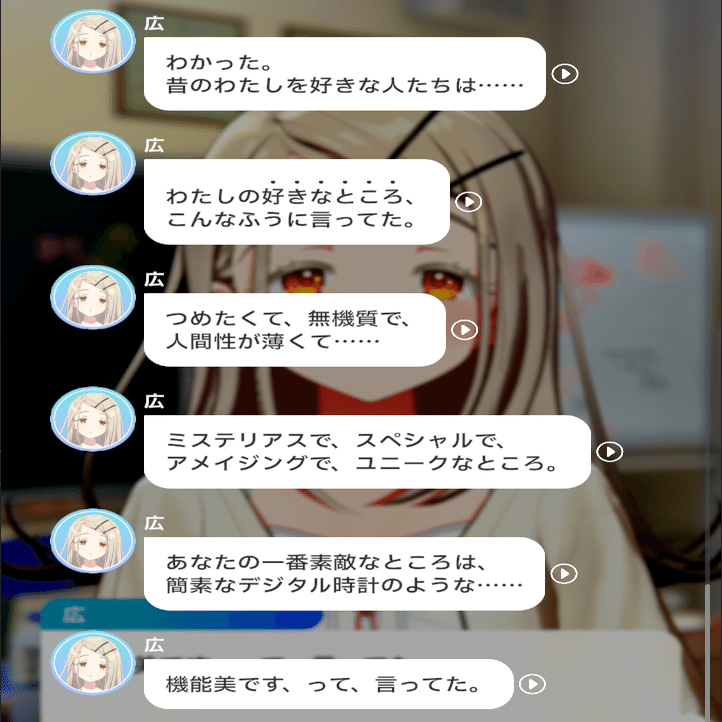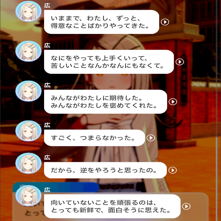こうして「単に自分が変わり者だから」という強引な結論づけによって導いた「自分の性質」から、それに合わせた行動を取るようになった、というのがプレイヤーの見ている広の姿なのだと思います。
