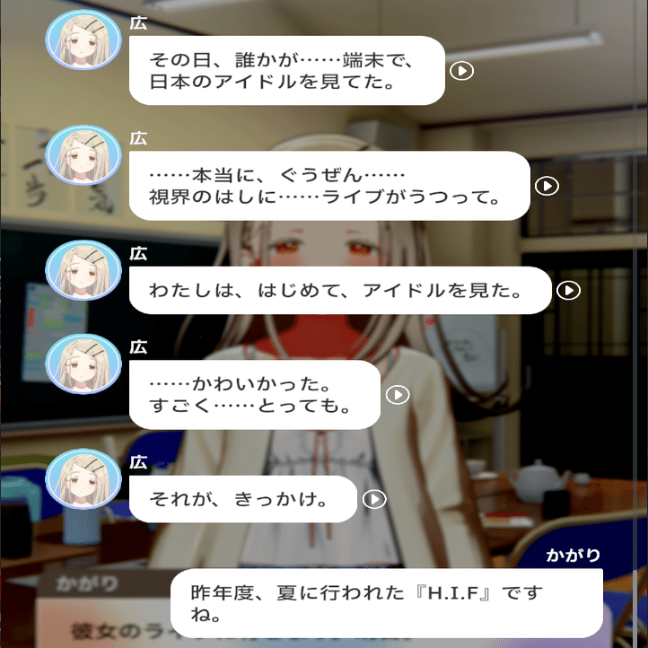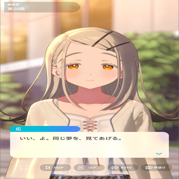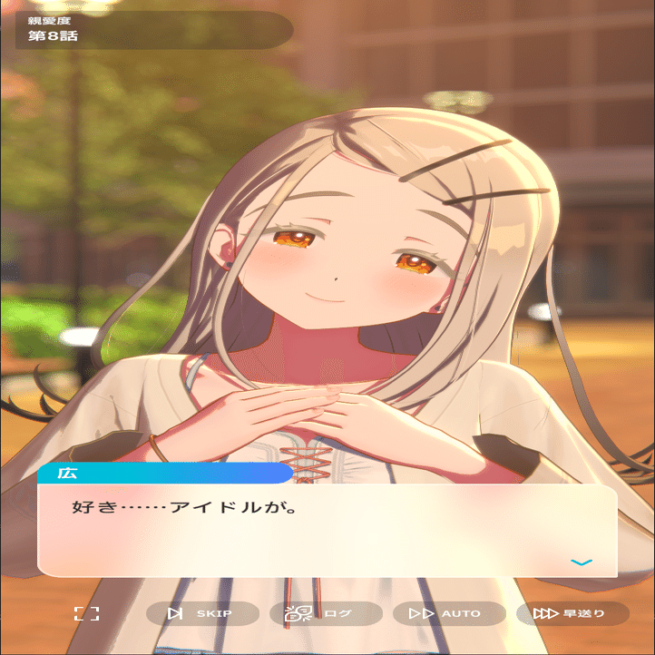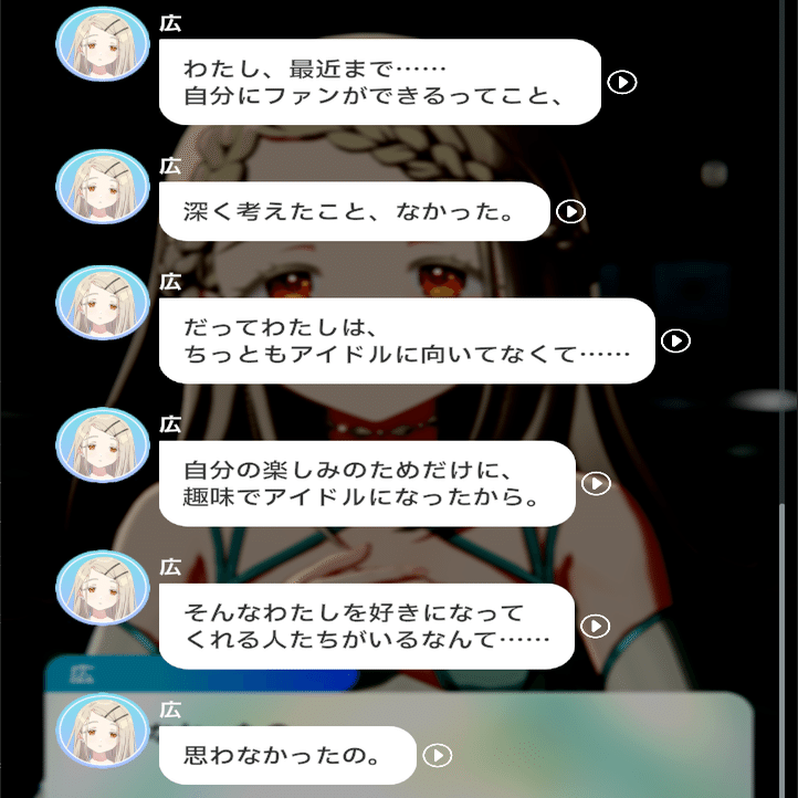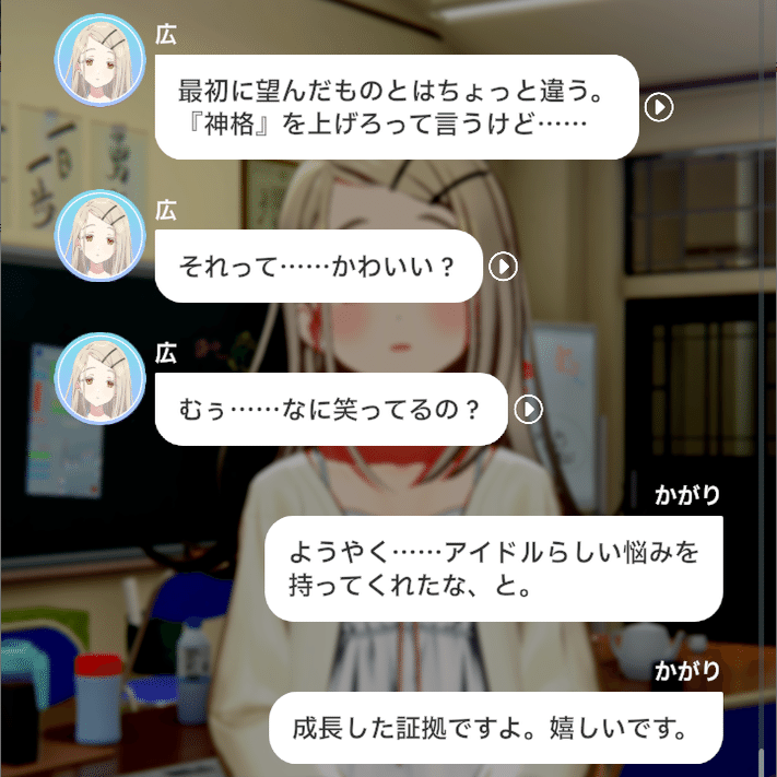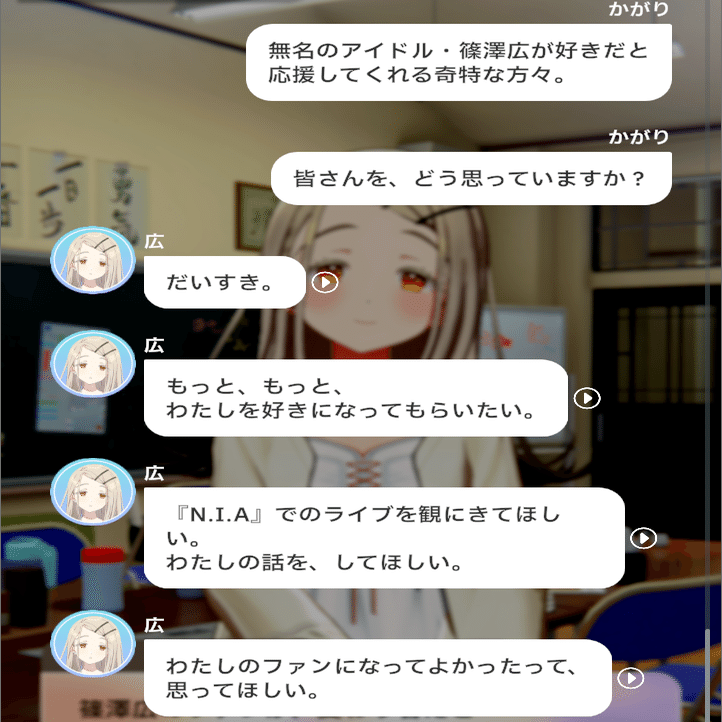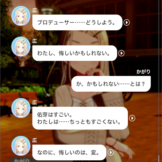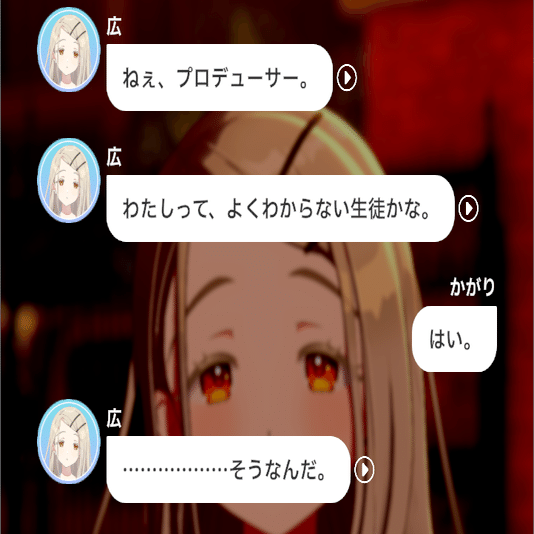 各種コミュを見てきたプレイヤーは知っていますが、広はその経歴や見た目、雰囲気から想像する「物静かな少女」では全くなく、とてもよく話し、積極的に人と交流し、面白そうなイベントには首を突っ込む、賑やかなことや悪戯が好きな子です。