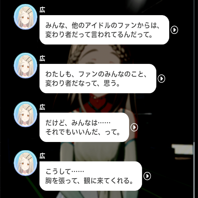 広は、歌唱もダンスも自身の見せ方も大変未熟で、アイドルへの向き合い方も不誠実で、そんな彼女をわざわざ選んで応援するファンは「変わり者」だと周りから言われます。