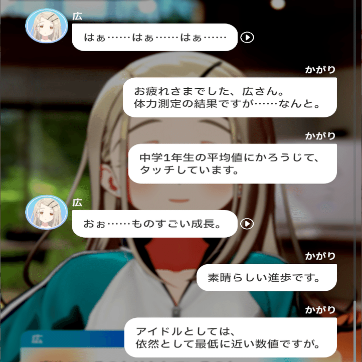 なので別に「一般生徒並みになっている」とか「平均値に近くなってきている」でもいいところを、広の嗜好に合わせて「中学1年生の平均値にかろうじてタッチ」という極力ひどく聞こえる言い方を選んでいるプロデューサーのテクニックが光りますね。