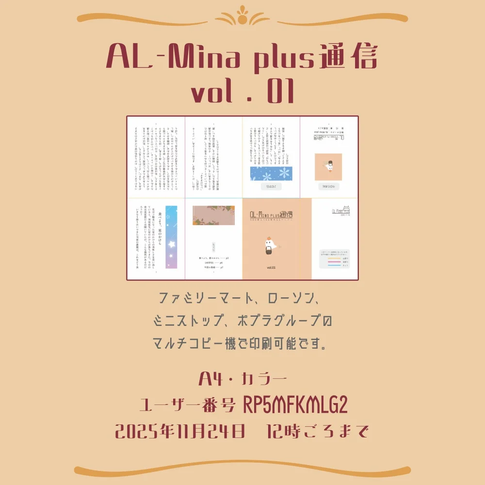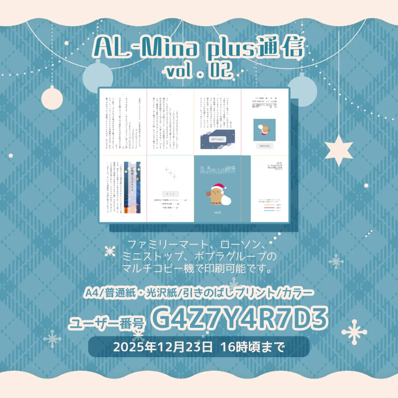 萩尾みこり|AL-Mina plus@ap_hagio3mo agoサークル活動の一貫でペーパーを作りました。ネットプリントに登録していますので、召しましたらどうぞ!ファミリーマート、ローソン、ミニストップ、ポプラグループのマルチコピー機で印刷可能です。A4・カラーユーザー番号 RP5MFKMLG22025年11月24日 12時ごろまで