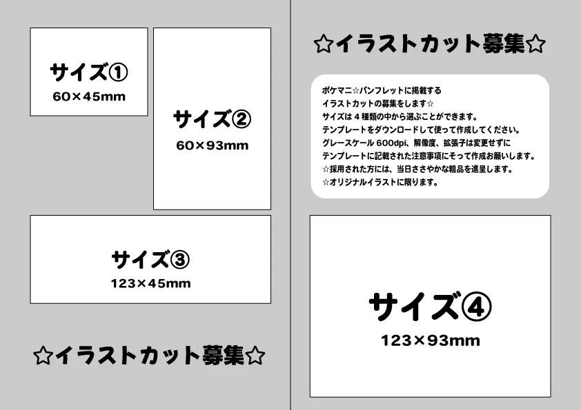 PM企画☆ポケットマニア☆@pokemani2w ago【ポケマニ☆41】パンフレット原稿募集のお知らせパンフレットに掲載するイラストカットを募集します。採用された方には当日ささやかな粗品を進呈いたします。テンプレートを使って作成してくださいね!テンプレートはこちらから→https://pokemani.fun/archives/514【ポケマニ☆41】パンフレット原稿募集について – ポケットマニア☆