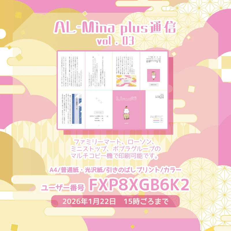 萩尾みこり|AL-Mina plus@ap_hagio1mo agoあけましておめでとうございます。今月もサークル活動の一貫でペーパーを作りました~ネットプリントに登録していますので、紹介画像を見て気になりましたらどうぞよろしくお願いします!ファミリーマート、ローソン、ミニストップ、ポプラグループのマルチコピー機で印刷可能です。A4 / 普通紙・光沢紙 / 引きのばしプリント / カラーユーザー番号 FXP8XGB6K22026年1月22日 15時ごろまで