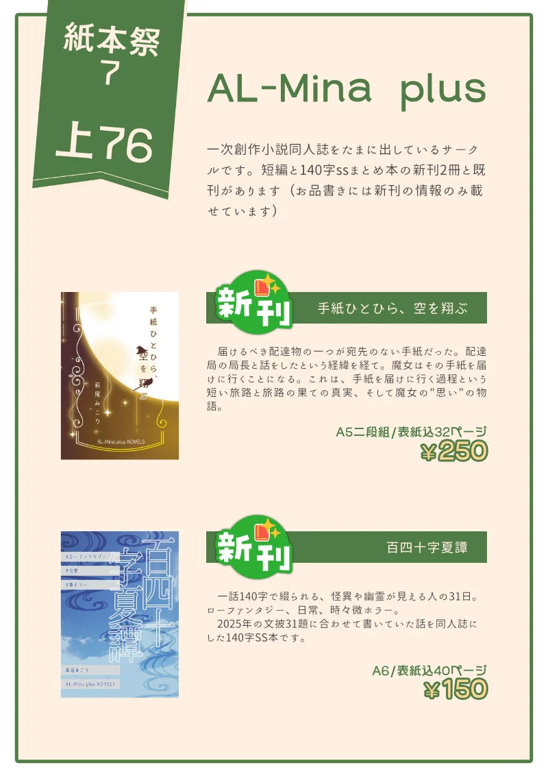 萩尾みこり|AL-Mina plus@ap_hagio5mo ago来月開催のオンラインイベント「紙本祭7」に参加します!スペース番号「上76」AL-Mina plus です。新刊にローファンタジー・日常・時々微ホラー140字SS本と魔女がわけありの手紙を届けに行くハイファンタジー短編があります。よろしくお願いいたします~#紙本祭