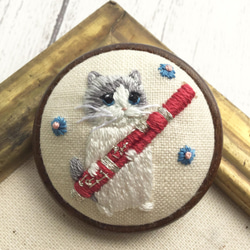 ファゴットを吹くネコ♫刺繍ブローチ☆動物楽器シリーズ2