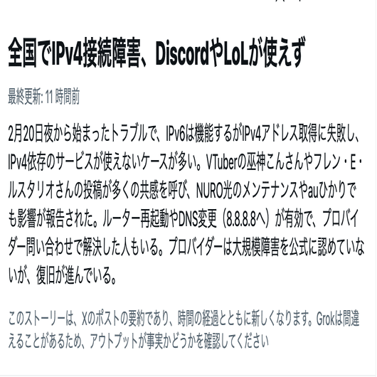 つい先日、X / Twitter で 、VTuberでREJECT所属の巫神こんさんの自宅ネットワークのトラブルのツイートがバズってました。内容を見て「YouTubeだけ繋がるって、IPv6っぽい厄介そうな問題だなー」とぼんやり眺めてました。