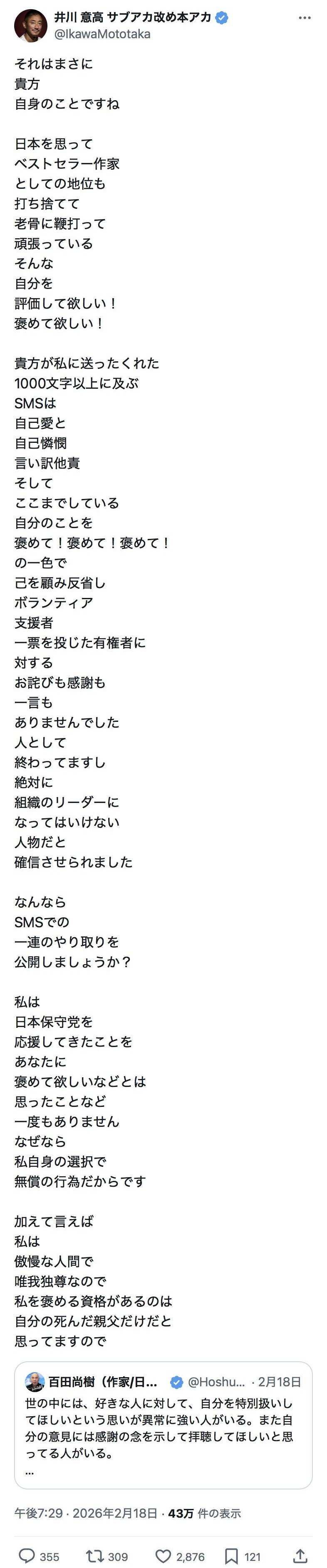 【愛国】日本保守党・百田尚樹と井川意高、決別しお互いを罵り合う「人として終わってる。絶対に組織のリーダーになってはいけない人物」 2026年02月20日 カテゴリ:日本保守党 1: Anonymous ★ 2026/02/17(火) 10:26:40.61 ID:Xgq9VnDx9 https://news.yahoo.co.jp/articles/9c157686e7a757424f6e9ef034f61b6d92f4d78d 作家で日本保守党の代表を務める百田尚樹参院議員が16日午後、自身のX(旧ツイッター)を更新。大王製紙の社長と会長を務めた井川意高(もとたか)氏に対し、「ミュート」する旨を通達した。 同党は今回の衆院選で小選挙区、比例代表に計20人を擁立したが、議席の獲得には至らなかった。 百田氏は15日夜、井川氏がXで「断言するが 今のままでは 日本保守党は5年後には無くなっている 悲しいけど」と書いたポストを引用。「別に日本保守党が無くなってもいいけどね。日本が亡くなりさえしなければ。わしは5年後の日本が心配や…」と述べ、続くポストで「保守党の未来を心配してくれている人がいるが、そんなことはどうでもいいこと。日本を豊かに強くしてくれるなら私はどこの党でも応援する!私は保守党を守りたいのではない、日本を守りたいのだ。その為なら保守党が無くなっても全然かまわない。これは強がりでも何でもない。正直なところ、早く引退して平和な日本でのんびり老後を送りたいのだ」とつづった。 これに対し、井川氏が16日未明「だったらご自身の発言を戒めてください 7万人の党員と145万の票を投じてくださった方々 そしてその票を掘り起こしてくださったボランティアの方々の血の滲む努力を たった数行のポストで台無しにするようなことは 組織のリーダーにあるまじき行為です 万死に値します」とポスト。すると、百田氏はこの投稿を引用しつつ16日午後の更新で「何、揚げ足取ってるの? 万死に値する? 私が必死で立ち上げた日本保守党は何より大事なのは言うまでもない。しかし『それ以上に大事なのは日本』ということを言ったまでのこと。はたから批判だけしてる人の言葉遊びには付き合ってられない。ミュートしとくわ」と井川氏に告げた。 その後、百田氏は「ストーカーって、憎しみと同じくらい愛を持ってるんだよね。ただ、その愛は気持ち悪いくらいゆがんでるけどね」「笑うのは、自分がストーカーになってることさえ気付いていない人間がいること。頭の中はそればっかりになってるのにね」などとも投稿。井川氏は「これまで応援してきた人間をストーカーと呼ぶクソクズ」などと返していた。 井川氏は日本保守党の応援を公言していたが11日、百田氏がXに投稿したポストの内容などをめぐって、同党との「決別」を表明したばかり。 引用元:https://hayabusa9.5ch.net/test/read.cgi/mnewsplus/1771291600/ 【【愛国】日本保守党・百田尚樹と井川意高、決別しお互いを罵り合う「人として終わってる。絶対に組織のリーダーになってはいけない人物」】の続きを読む タグ :#百田尚樹#井川意高#日本保守党#愛国者#ウヨゲバ