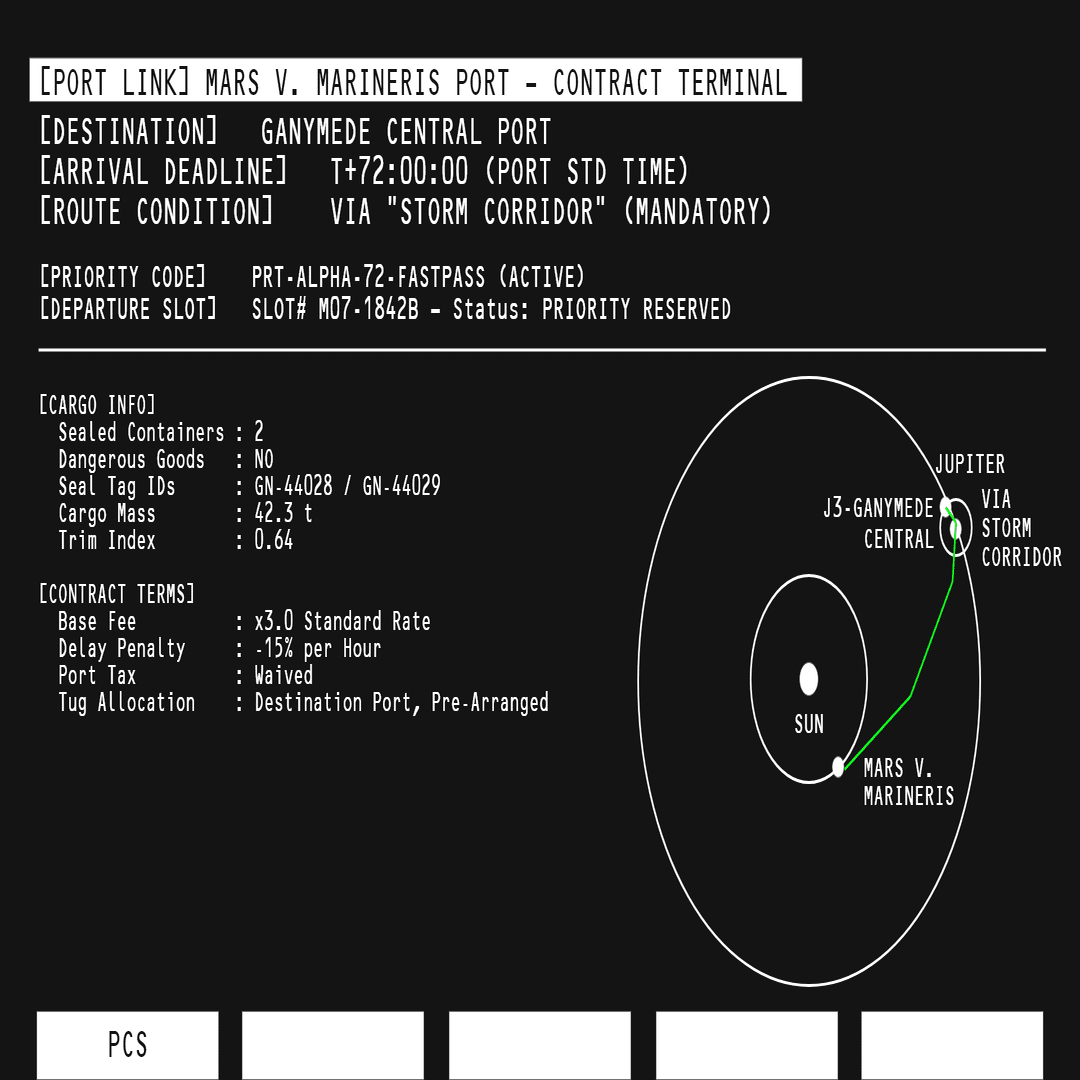 このコードは通常、大型公社船や政府契約船にしか発行されず、主人公のようなフリーの運び屋に適用されるのは極めて異例です。惑星圏間の裏取引の存在が示唆される部分でもあります。Departure Slot:SLOT# M07-1842B(Priority Reserved)