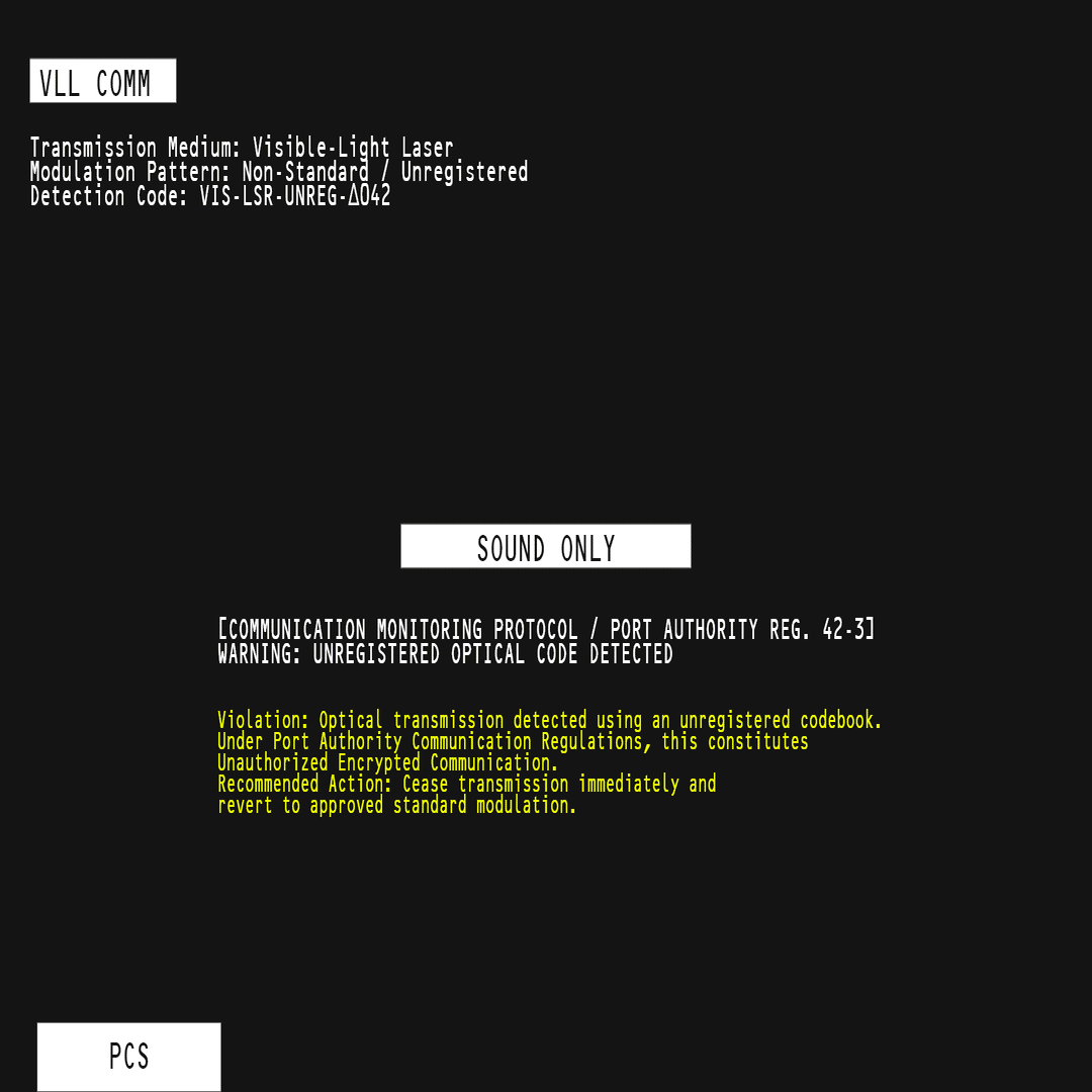 この画面は、港湾通信監視局による通信監査プロトコルの動作を表しています。VLL COMM(Visible Light Laser Communication)は、作中の太陽系においてよく用いられている可視光レーザー通信方式です。