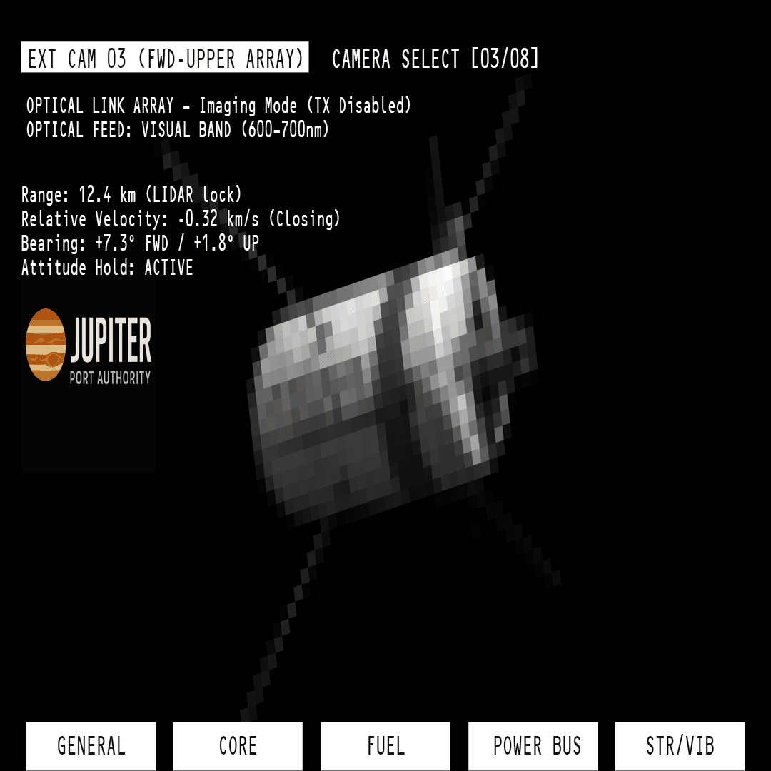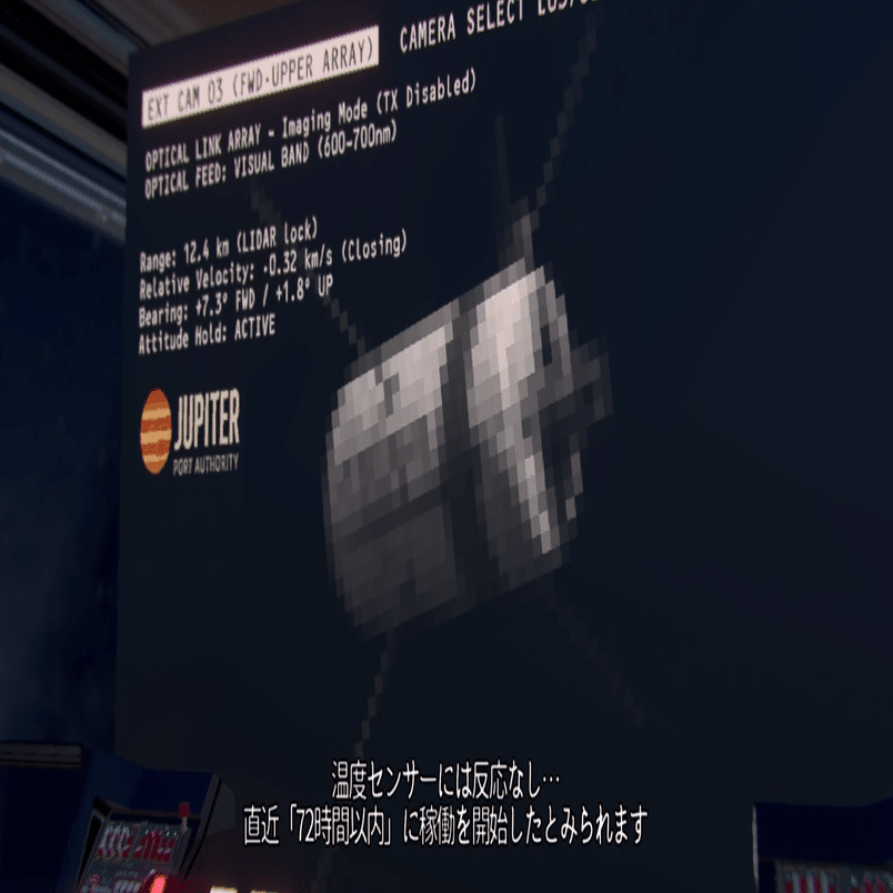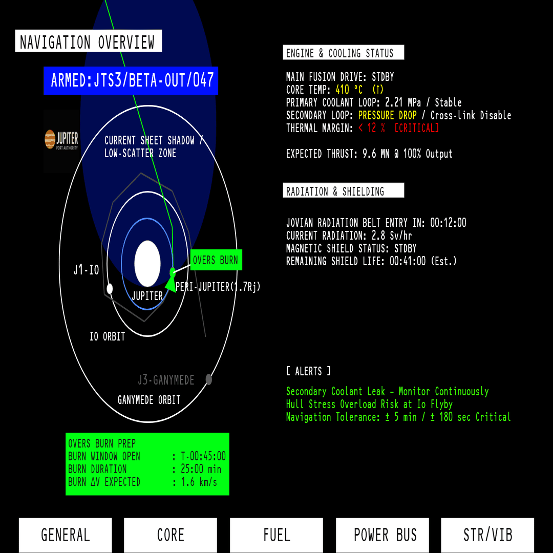 この画面は、木星圏への接近フェーズにおける航法統合ディスプレイを示しています。この航路はJovian Port Authority(木星港湾公社 / JPA)の標準航法フォーマットであり、ケイが直接監視・制御を行います。