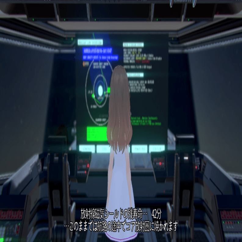 左側の航行図は、木星の磁気圏構造を重ねた航路表示です。青色の濃淡は放射線密度、薄緑のラインがケストレルのこれからの航路です。