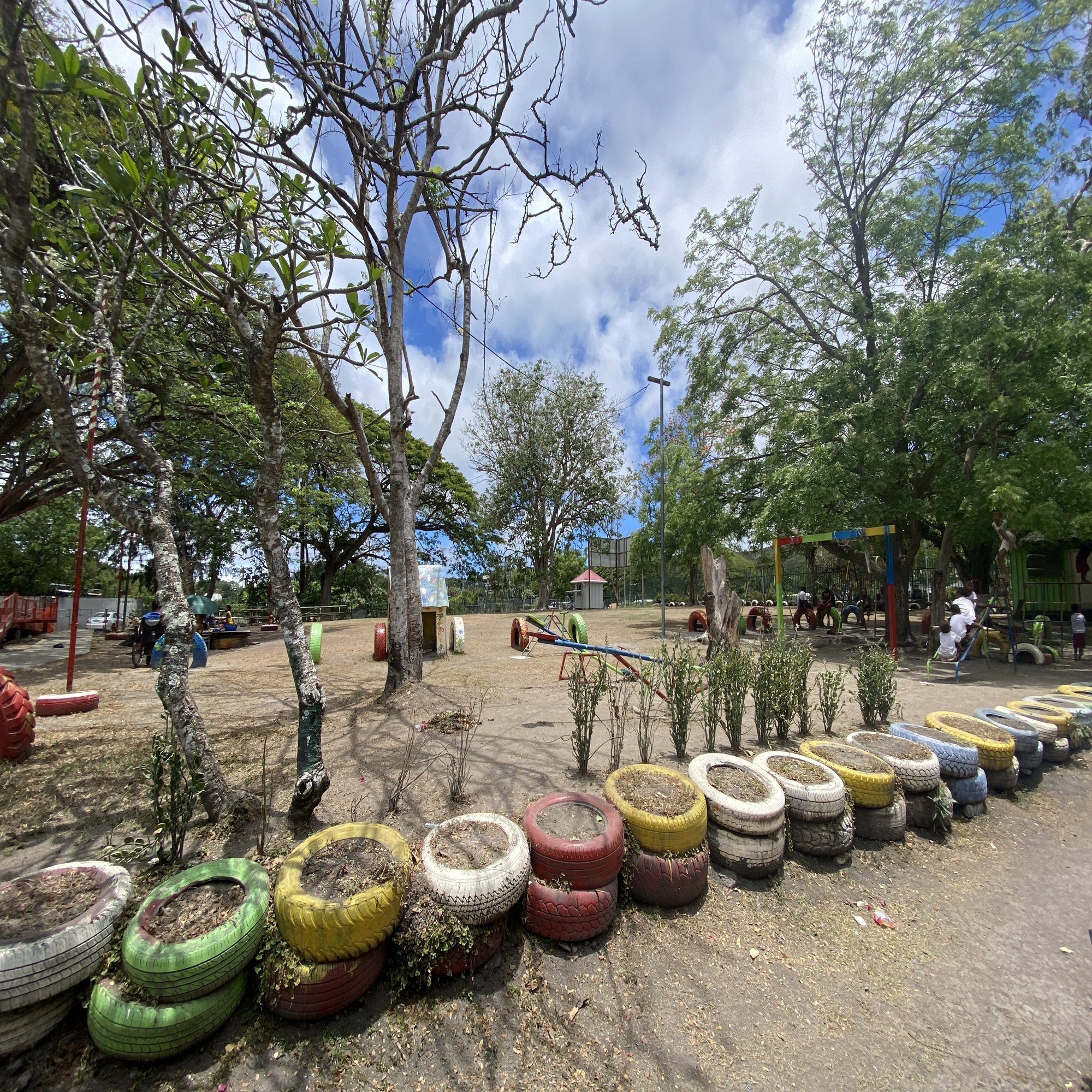 看板が見えたところを曲がって車をとめると、校庭らしき場所で子どもたちが遊んでいるのが見えた。車椅子の人や片足がない人もいるようだ。